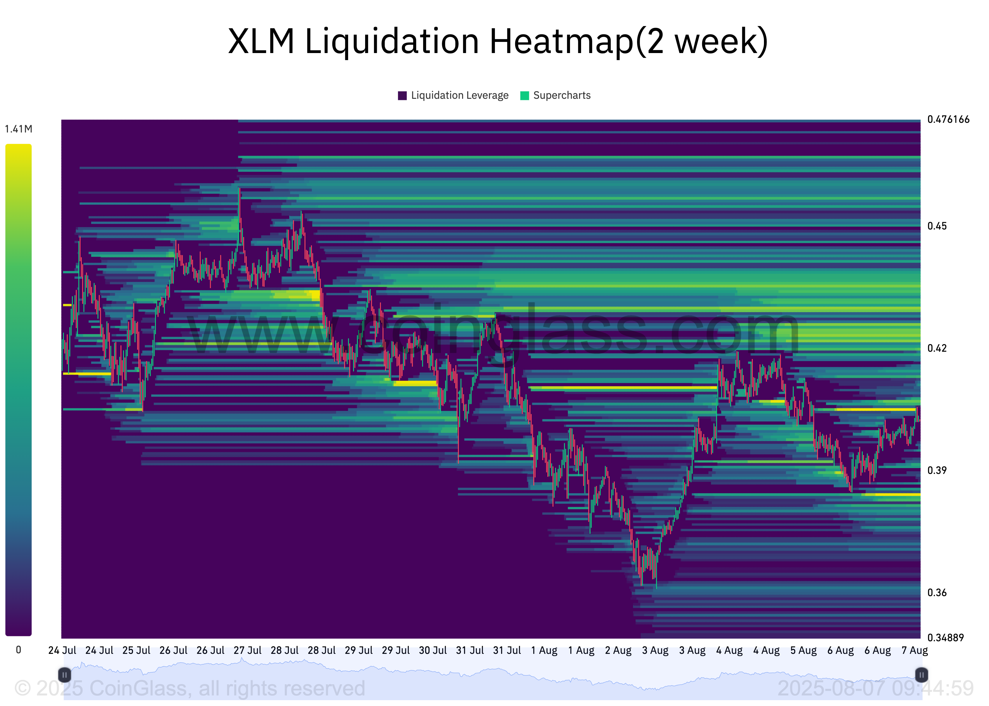Для XLM видимий кластер біля 0,42 доларів натякає на потенційний рух до цієї цінової точки. Це може підштовхнути імпульс і стати першим кроком до ширшого зростання ціни.