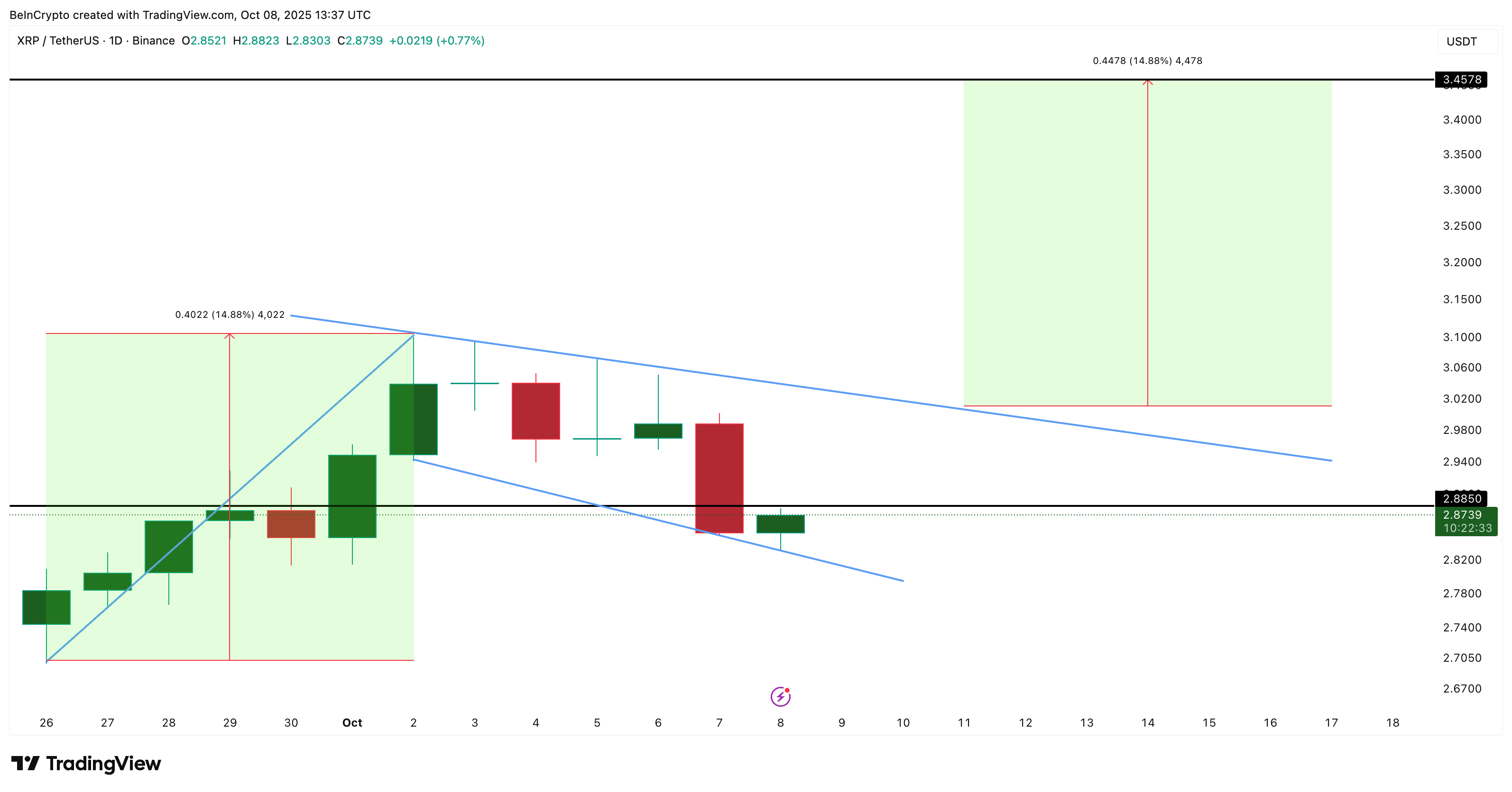 Прорив вище верхньої лінії прапора зазвичай підтверджує цю модель і часто запускає висхідний тренд, який відображає висоту попереднього флагштока. Це свідчить про потенційне зростання на 15% до 3,45 долара для XRP. Якщо попит на цьому етапі зміцниться, альткоїн може спробувати зрости до 4 доларів і досягти нового піку.