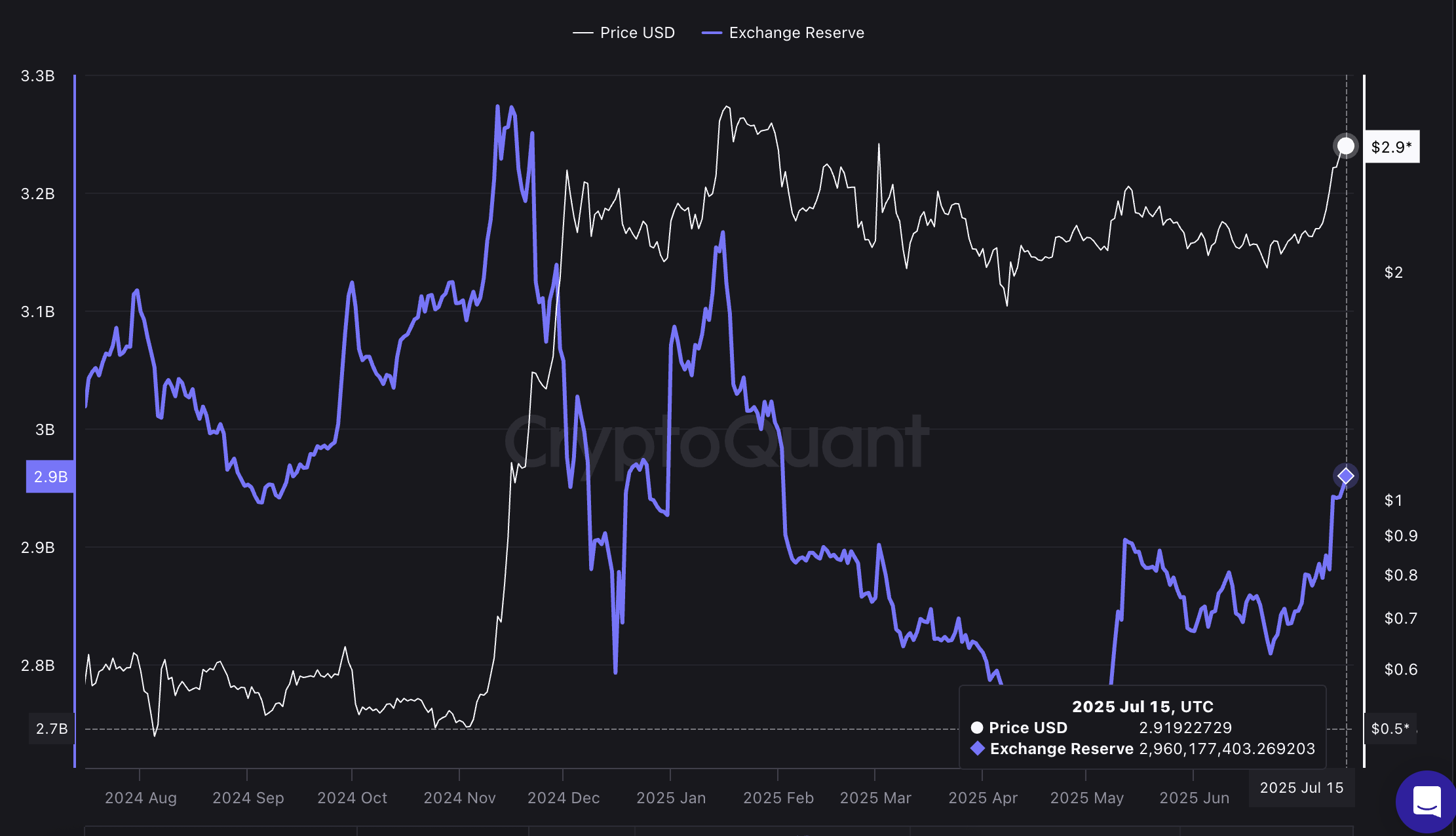 Резерви XRP на біржі Binance зросли до найвищого рівня (2,96 мільярда) з січня 2025 року, що сигналізує про можливий тиск на продаж. За даними CryptoQuant, востаннє резерви досягали такого рівня у травні 2025 року, коли XRP коштував близько 2,54 доларів. Тоді цей період супроводжувався корекцією на 20 %, коли токен впав до 2,01 доларів протягом наступних тижнів.
