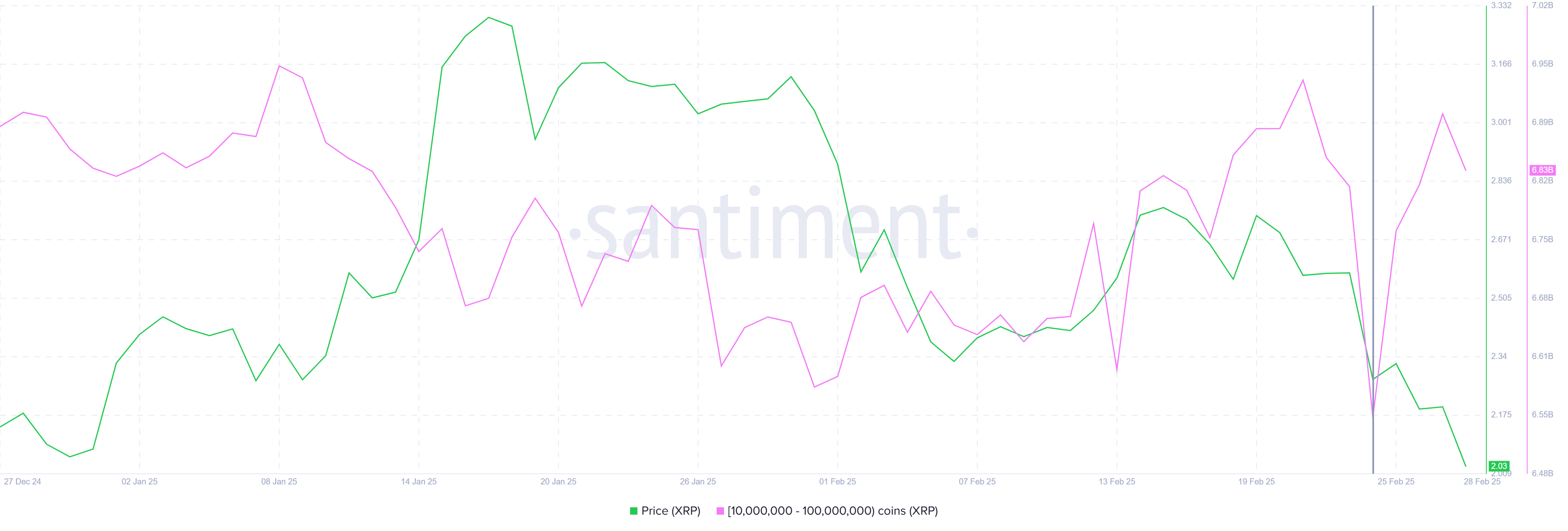 Адреси китів, які утримують від 10 мільйонів до 100 мільйонів XRP, додали понад 300 мільйонів XRP, що становить 609 мільйонів доларів за останні кілька днів. Це накопичення відбулося після того, як ці кити раніше розпродали свої активи, коли ціни були вищими, зафіксувавши прибуток.