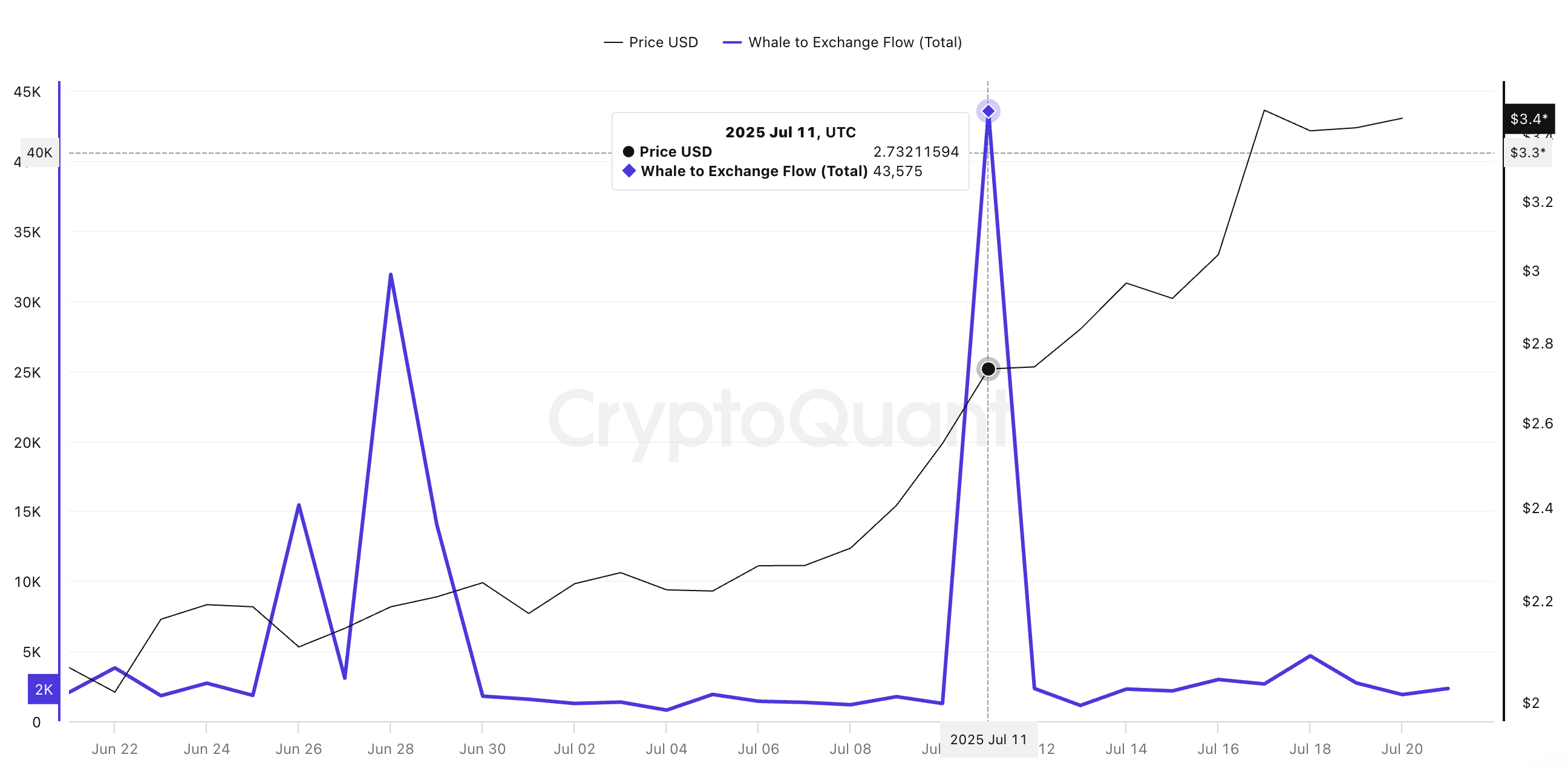 Одним із найчіткіших сигналів є поведінка китів. Ще 11 липня великі власники гаманців, які переміщували великі обсяги, перевели понад 43 575 XRP на біржі, ймовірно, готуючись до продажу. Але до 21 липня ця кількість зменшилася до лише 2 339 XRP. Це 94% зниження потоку китів на біржі.