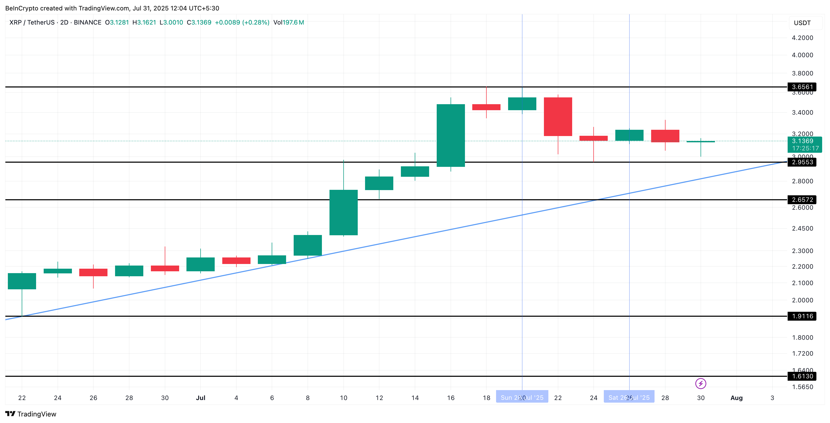 Останні дані показують, що притоки XRP на біржі залишалися низькими протягом більшої частини липня. Єдиний значний сплеск стався 11 липня, коли понад 220 мільйонів XRP надійшли на торговельні платформи. З того часу притоки здебільшого залишалися на низькому рівні. Останні дані на 29 липня показують, що лише 9,7 мільйона XRP перемістилися на біржі, тоді як ціна XRP торгувалася близько 3,12 доларів.