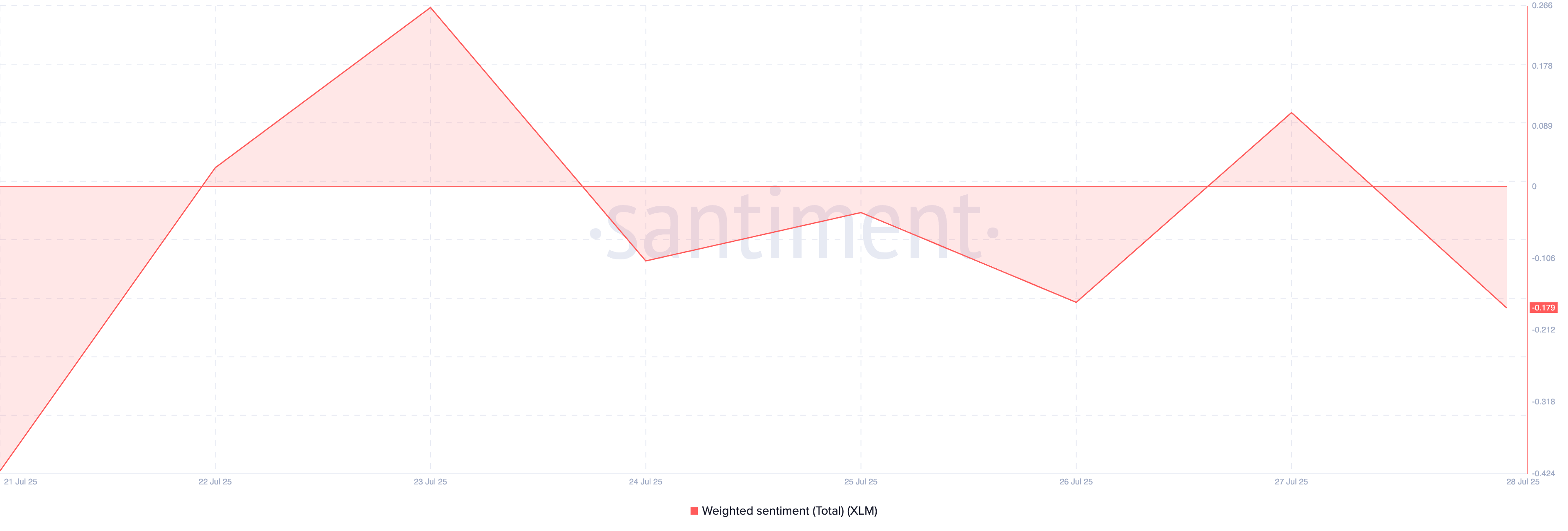 SponsoredКрім того, ончейн-настрій навколо XLM також став помітно негативним, що підсилює ймовірність подальшого зниження ціни. За даними Santiment, зважений настрій токена становить -0,179, що додає ведмежого тиску на його ціну.