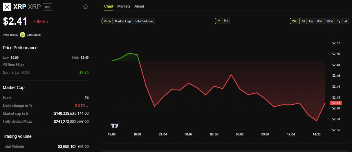 Ціна XRP зросла майже на 15% відразу після новин, що стало поворотним моментом для регулювання криптовалют у США. На момент публікації XRP торгувався за 2,41 доларів, що на 4% нижче за останні 24 години.