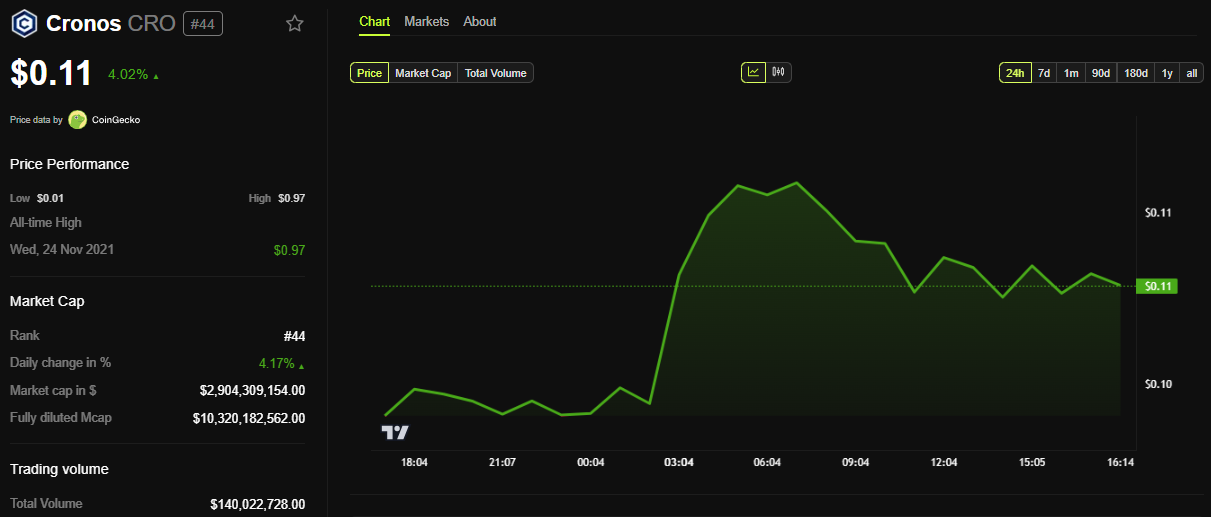 Дані BeInCrypto показують, що CRO торгувався за 0,11 доларів на момент публікації, піднявшись на понад 4% за останні 24 години.