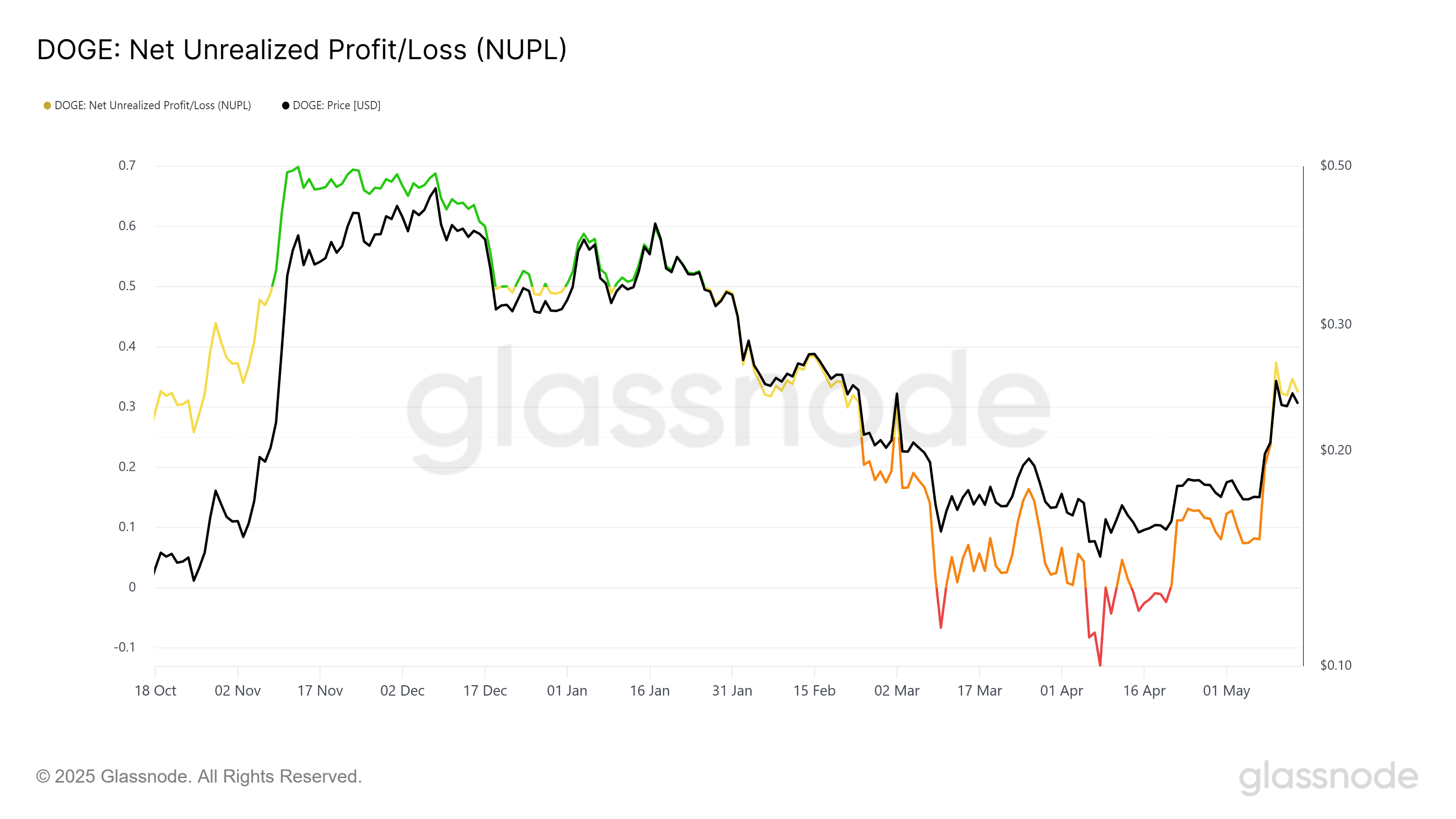 Індикатор Net Unrealized Profit/Loss (NUPL) для Dogecoin наразі знаходиться на тримісячному максимумі. Це свідчить про те, що більша частина власників DOGE отримує прибуток, що сигналізує про здорові ринкові умови. Розташований у зоні оптимізму, NUPL відображає позитивні очікування інвесторів щодо подальшого зростання ціни.