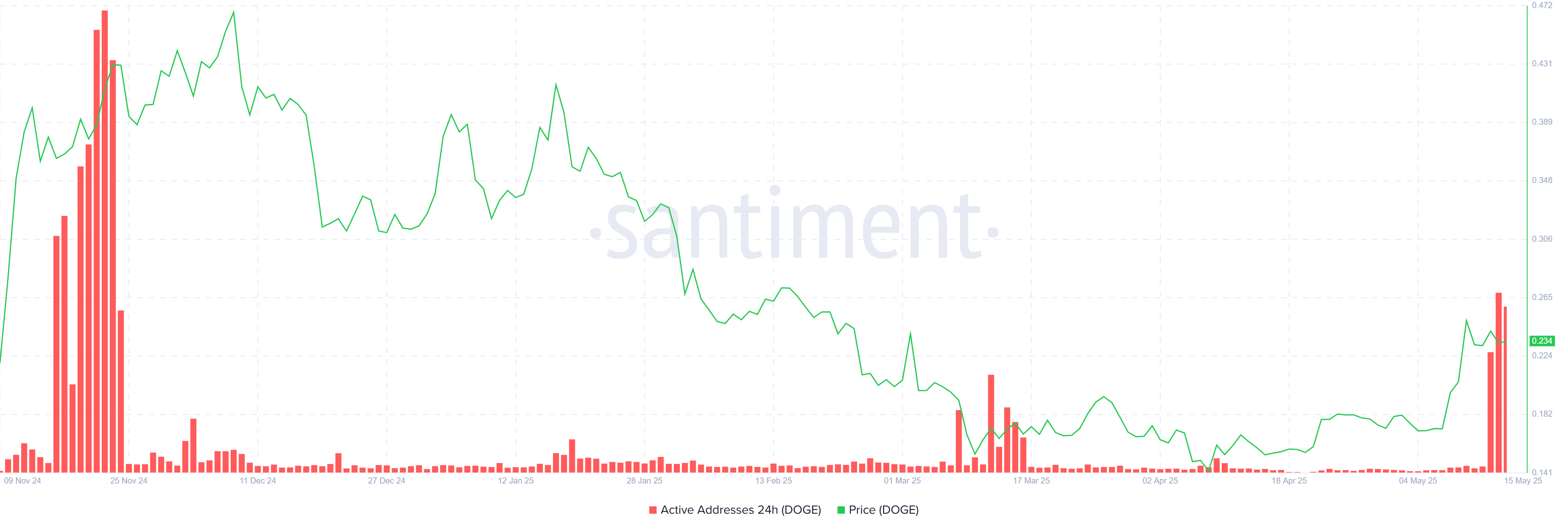 Активні адреси для Dogecoin досягли шестимісячного піку, що вказує на зростання залученості мережі. Вищі рівні активності зазвичай сигналізують про зростаючий інтерес інвесторів, оскільки більше учасників здійснюють транзакції або утримують актив. Ця тенденція підтримує думку, що зростаючі прибутки заохочують користувачів бути більш активними в мережі DOGE.