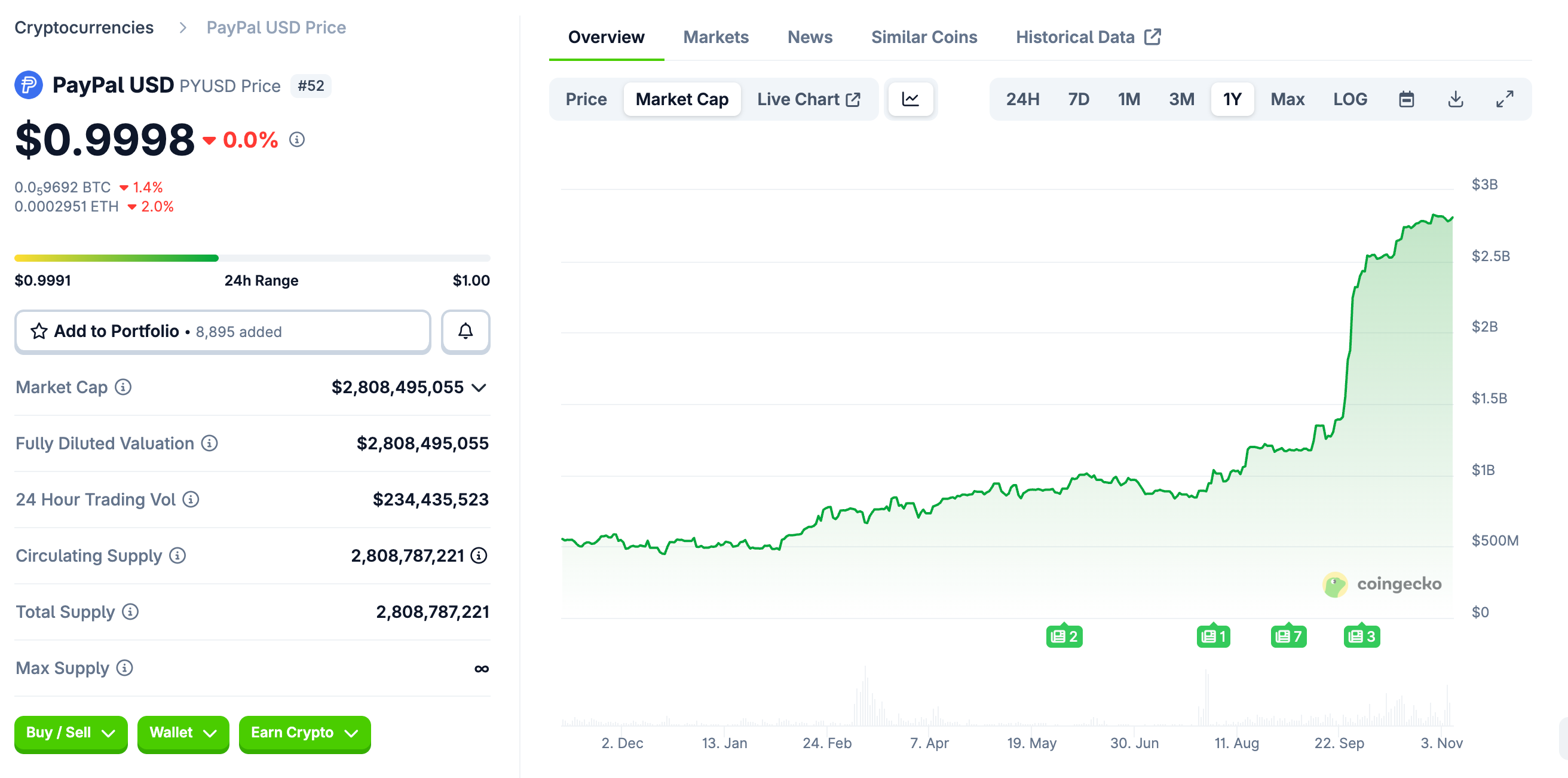 Стейблкоїн PYUSD від PayPal має ринкову капіталізацію в 2,8 мільярда доларів і розширився до мережі Stellar, орієнтованої на 170 країн. Функція компанії «Pay with Crypto» підтримує понад 200 000 продавців, які приймають платежі цифровими активами за допомогою миттєвої конвертації стабільних монет у фіат. Традиційні платіжні провайдери, включаючи Western Union, також вивчають пропозиції стейблкоїнів, оскільки регуляторна ясність покращується.