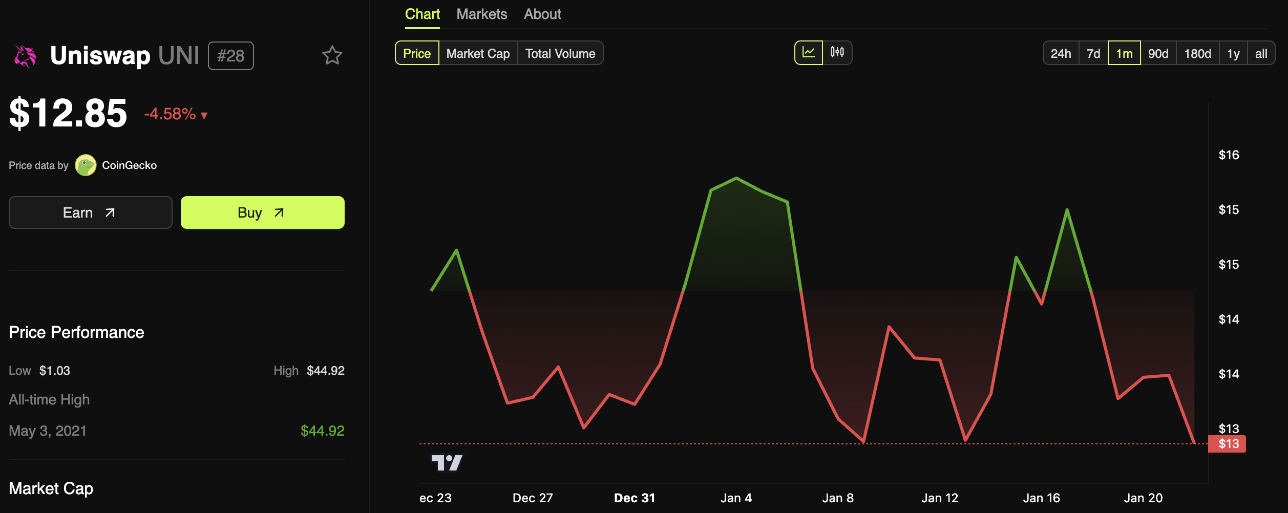 Токен UNI за останні тижні демонстрував значні коливання. У грудні минулого року UNI досяг трирічного максимуму, після чого зазнав різкого падіння.