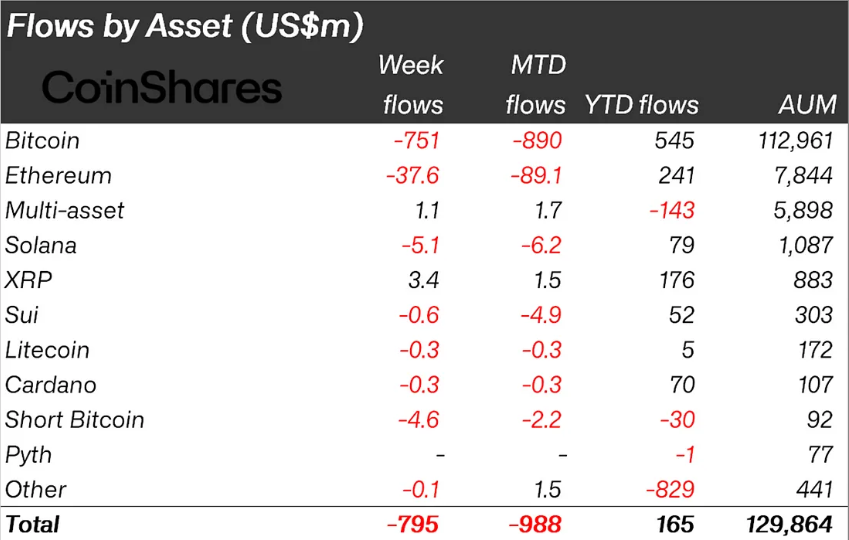 Відповідно до останнього дослідження CoinShares, минулого тижня відтік криптовалют досяг 795 мільйонів доларів. Це вже третій тиждень поспіль негативних потоків, оскільки фінансова невизначеність продовжує тиснути на настрої інвесторів.