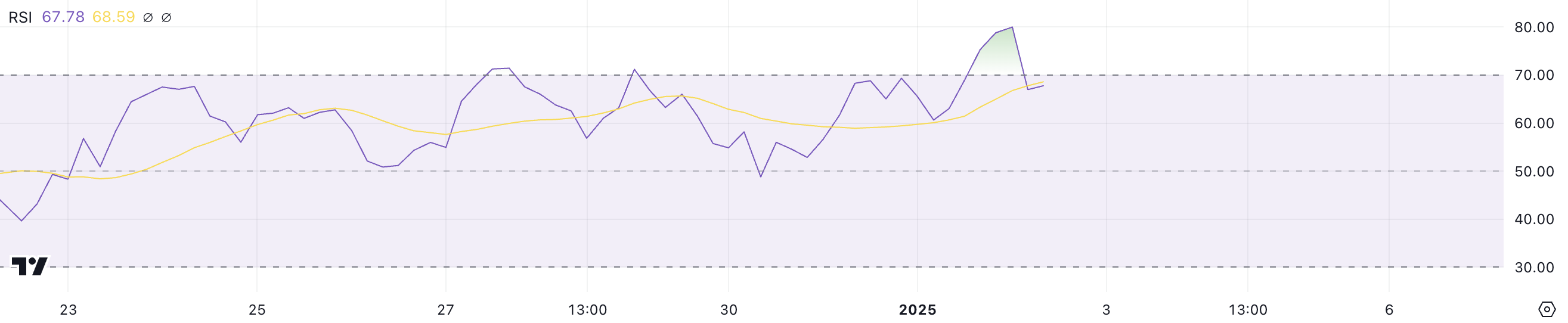 RSI на рівні 67,7 розміщує VIRTUAL трохи нижче порогу перекупленості 70, сигналізуючи, що актив все ще знаходиться в бичачій фазі, але наближається до рівня, де може бути доцільно проявити обережність, оскільки він наближається до потенційного опору.