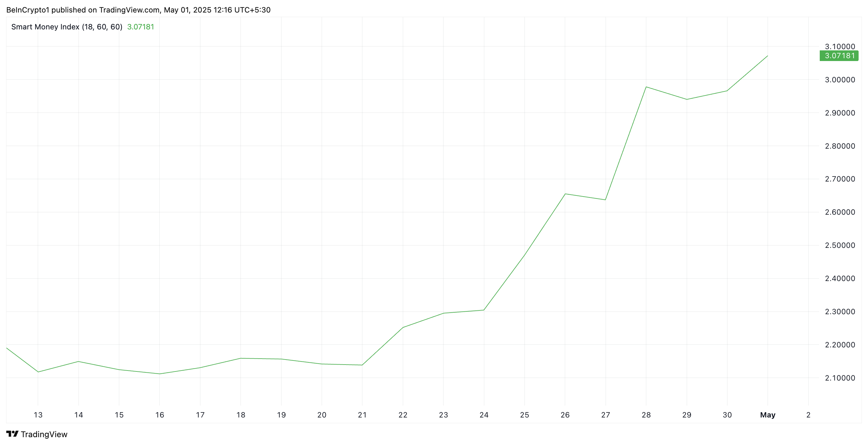 VIRTUAL розпочав своє зростання 22 квітня і з того часу постійно фіксує нові щоденні цінові максимуми. Зі зростанням його ціни спостерігається відповідне підвищення індексу Smart Money Index (SMI), який наразі становить 3,07.