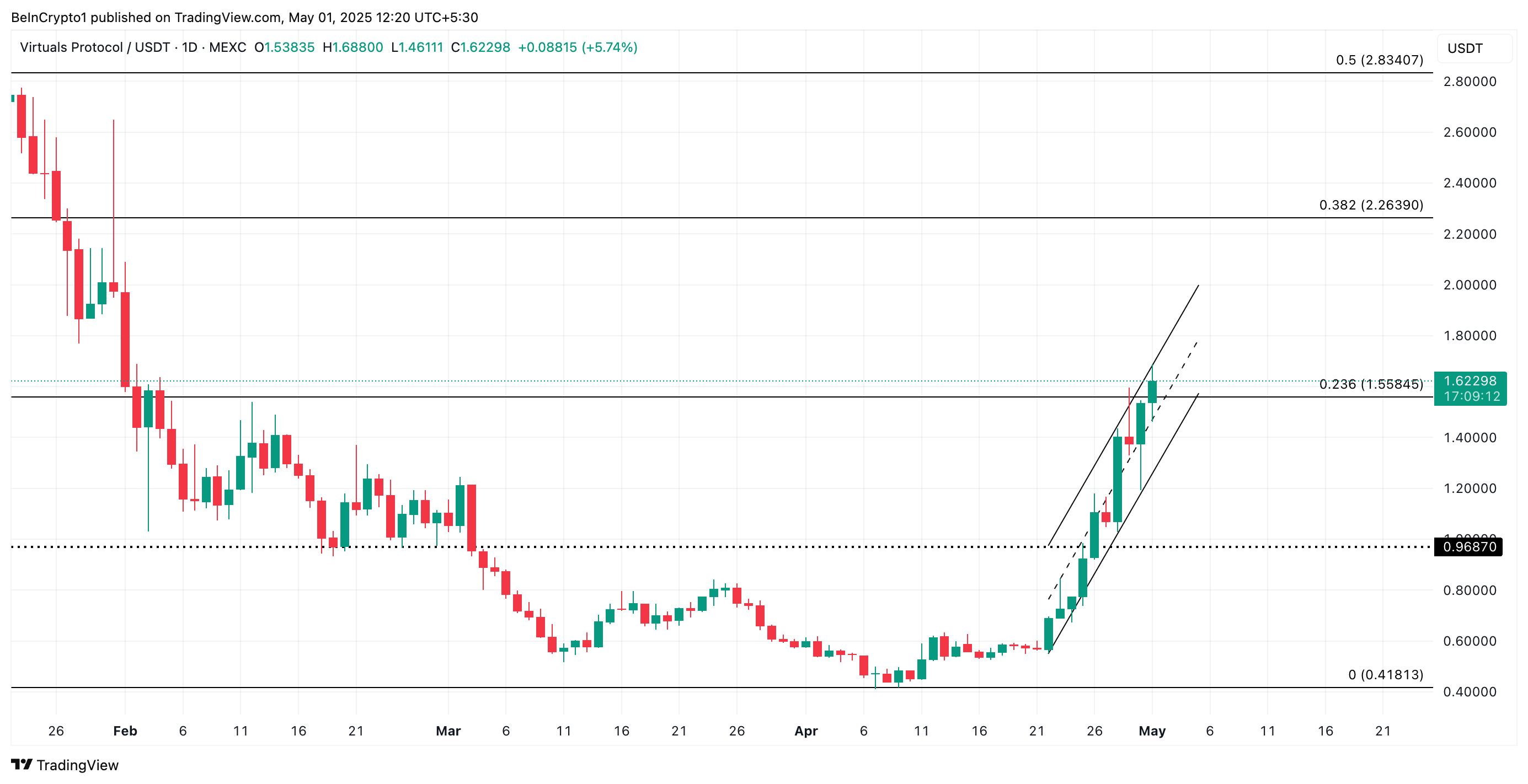 Трицифрове ралі VIRTUAL з 22 квітня призвело до його торгівлі в межах висхідного паралельного каналу. Цей патерн формується, коли ціна активу постійно робить вищі максимуми і вищі мінімуми, рухаючись у межах двох висхідних, паралельних трендових ліній.