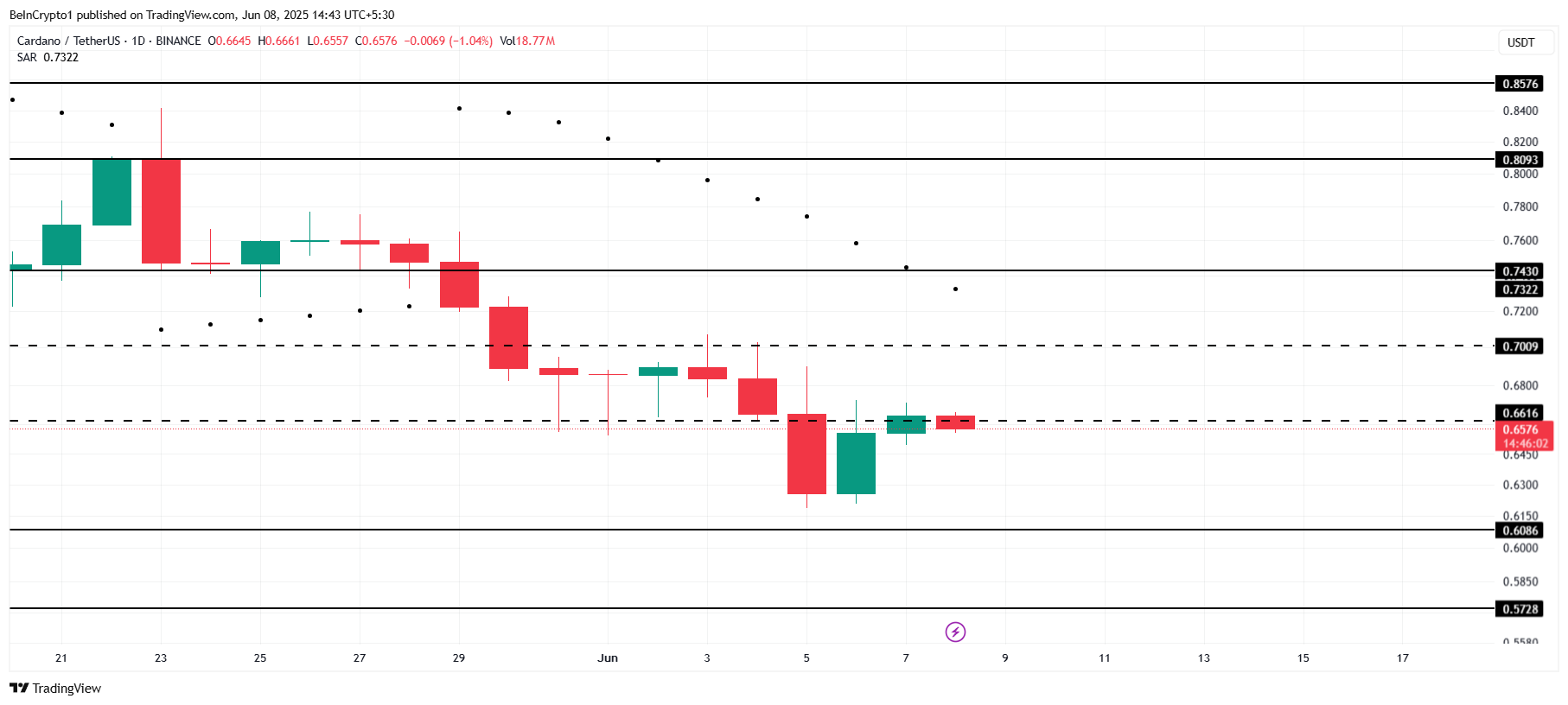 На момент публікації ціна Cardano становить 0,65 доларів, причому токен коливається навколо критичного рівня опору 0,66 доларів. Цей рівень є ключовим для підвищення ціни до 0,70 доларів.