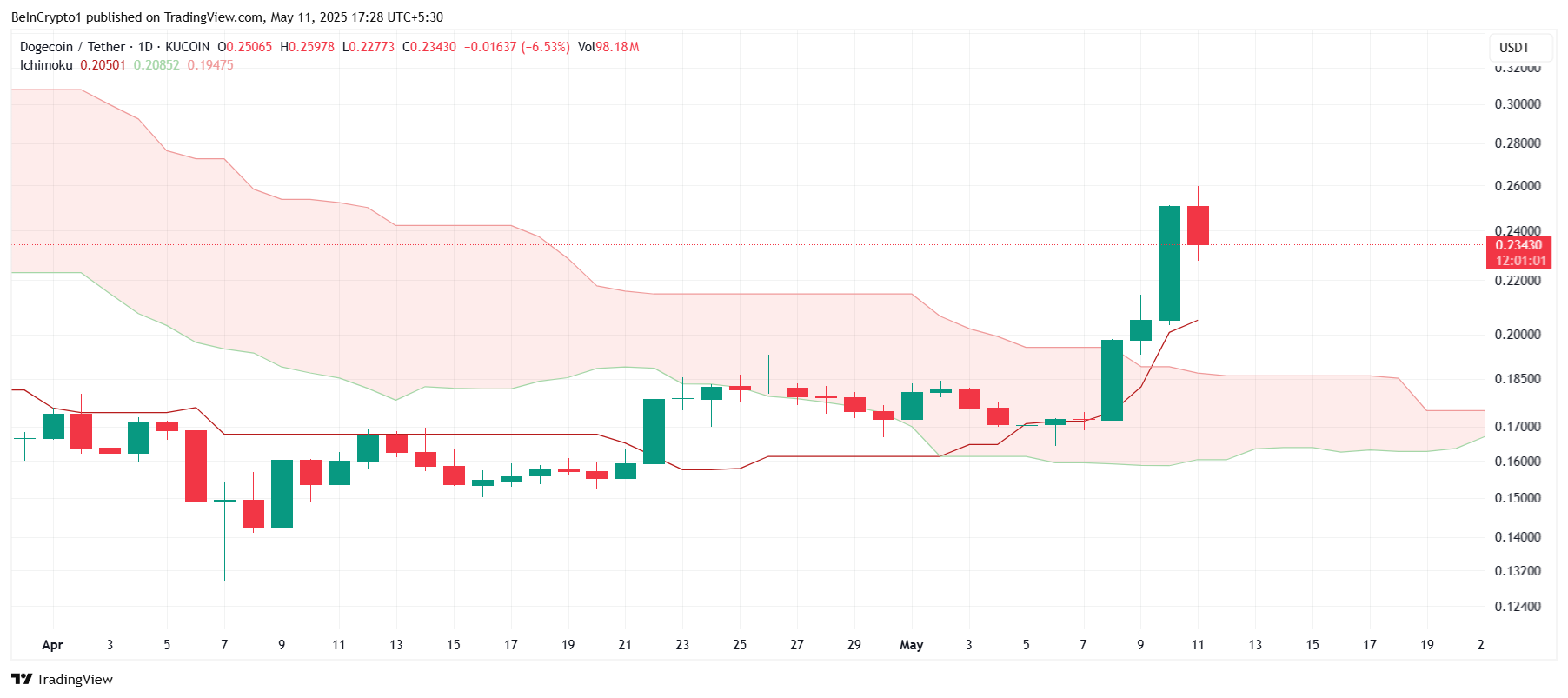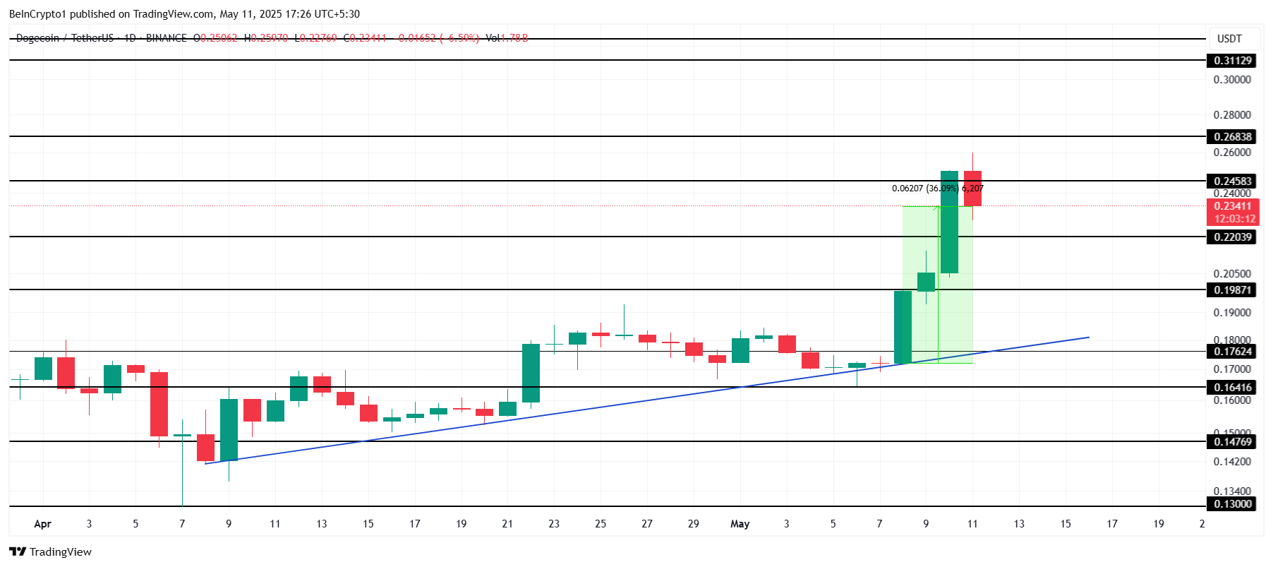 Успішний рух вище 0,245 доларів відкриє шлях до зростання до 0,268 доларів, що дозволить Dogecoin спростувати ведмежий прогноз і зберегти висхідну траєкторію.