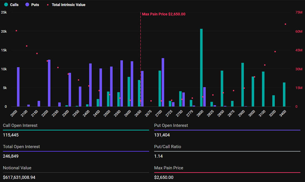 За даними Deribit, ці опціони, що закінчуються, мають співвідношення пут-колл 1,14. Максимальний рівень болю або страйк-ціна становить 2 650 доларів. Важливо зазначити, що співвідношення пут-колл для Ethereum перевищує 1, що свідчить про перевагу пут (продажних) опціонів над колл (купівельними) опціонами.