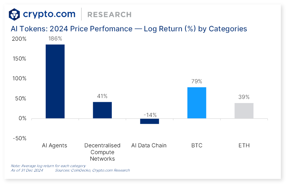 Вплив агентів ШІ на крипторинок вже був значним. Згідно з даними Crypto.com, штучний інтелект став найуспішнішим сектором у 2024 році, причому агенти ШІ особливо відзначилися найбільшим логарифмічним зростанням на 186%.