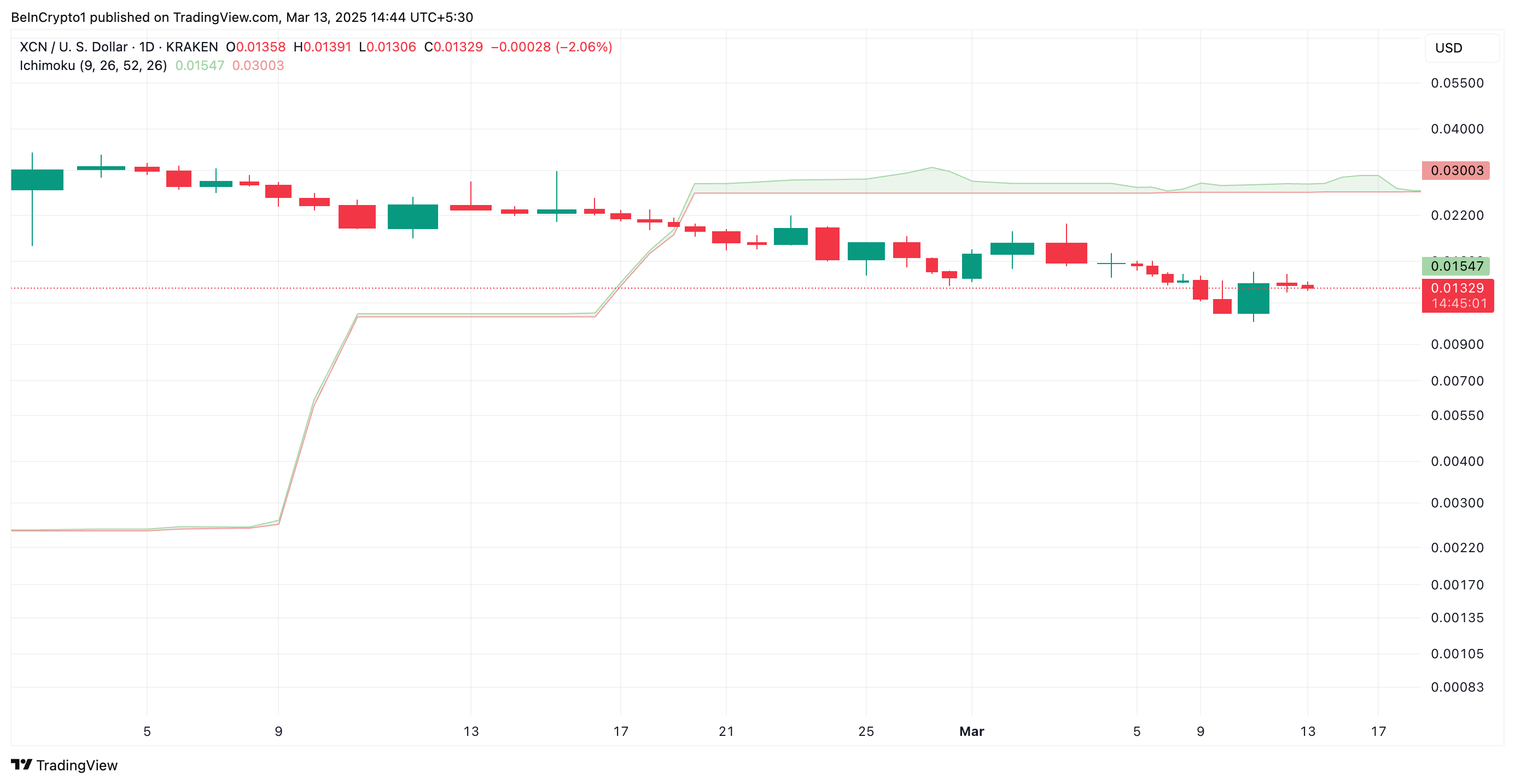 Для XCN його хмара Ічімоку формує динамічний опір над його ціною на рівні 0,015 доларів, що підсилює низхідний тиск на ціну монети.