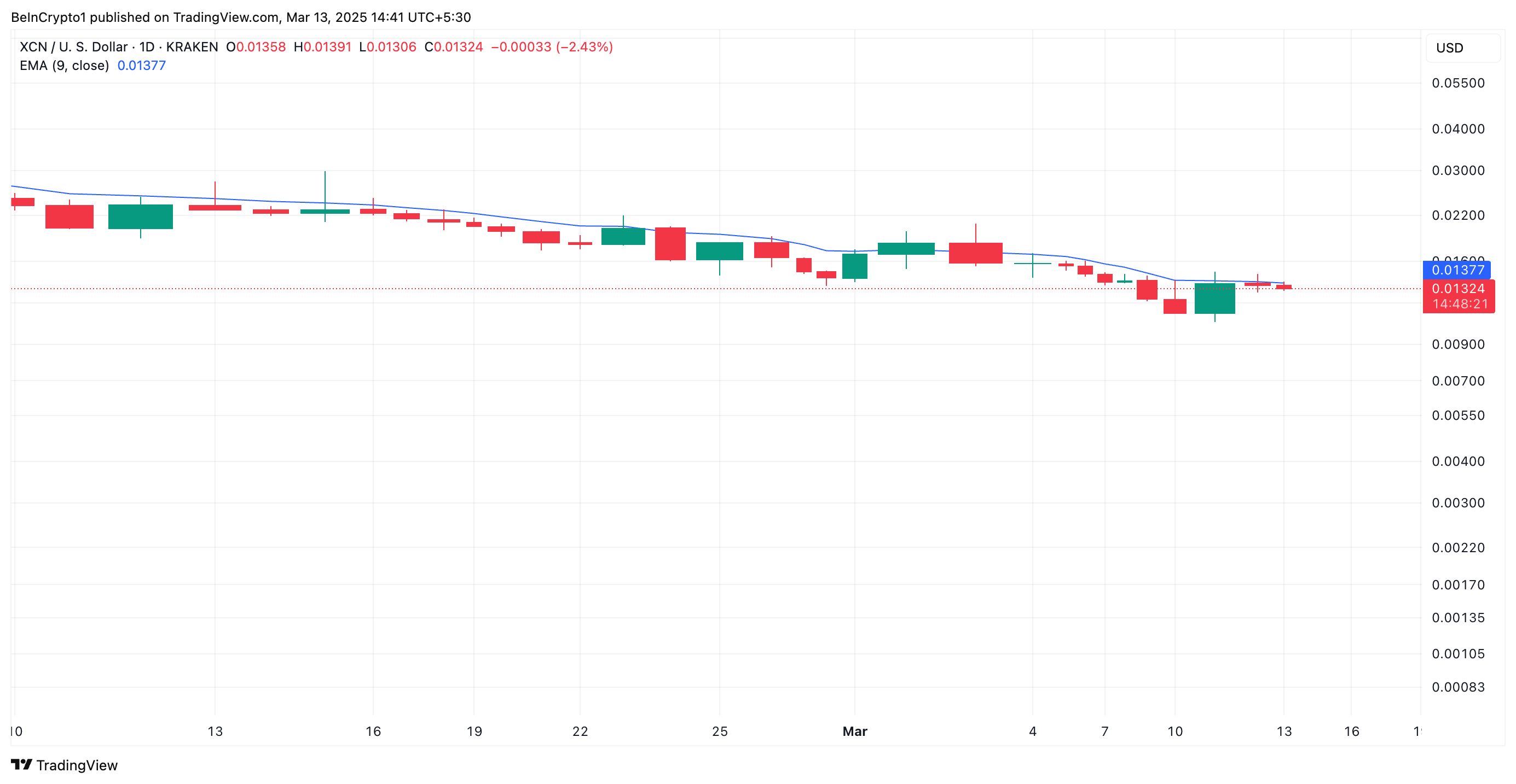 Значення з одноденного графіка XCN/USD показують, що альткоїн торгується нижче свого 20-денного змінного середнього.