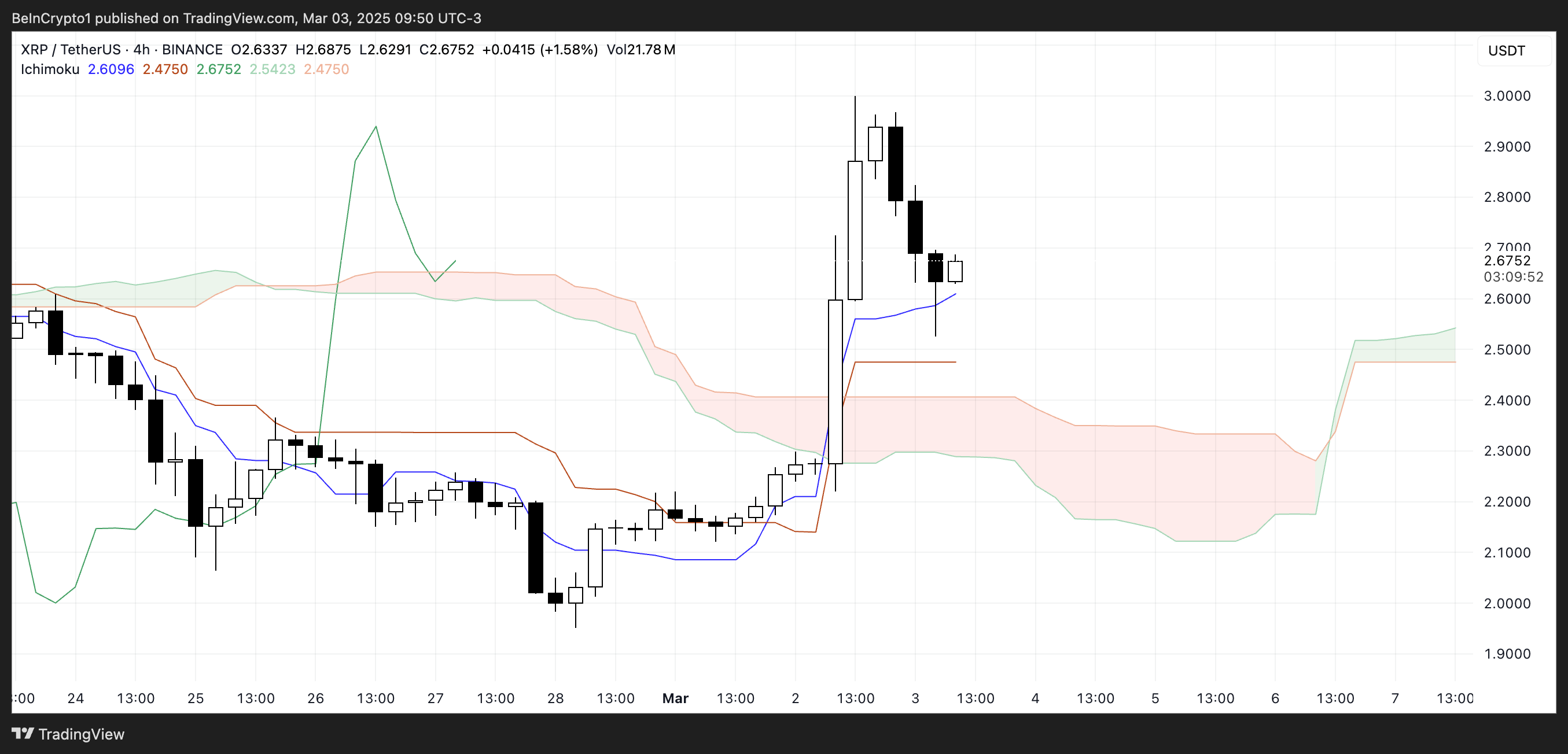 Аналіз графіка Ichimoku Cloud для XRP показує, що ціна різко прорвалася вище хмари (Kumo) після свого 30% зростання після включення до резерву криптовалют США.