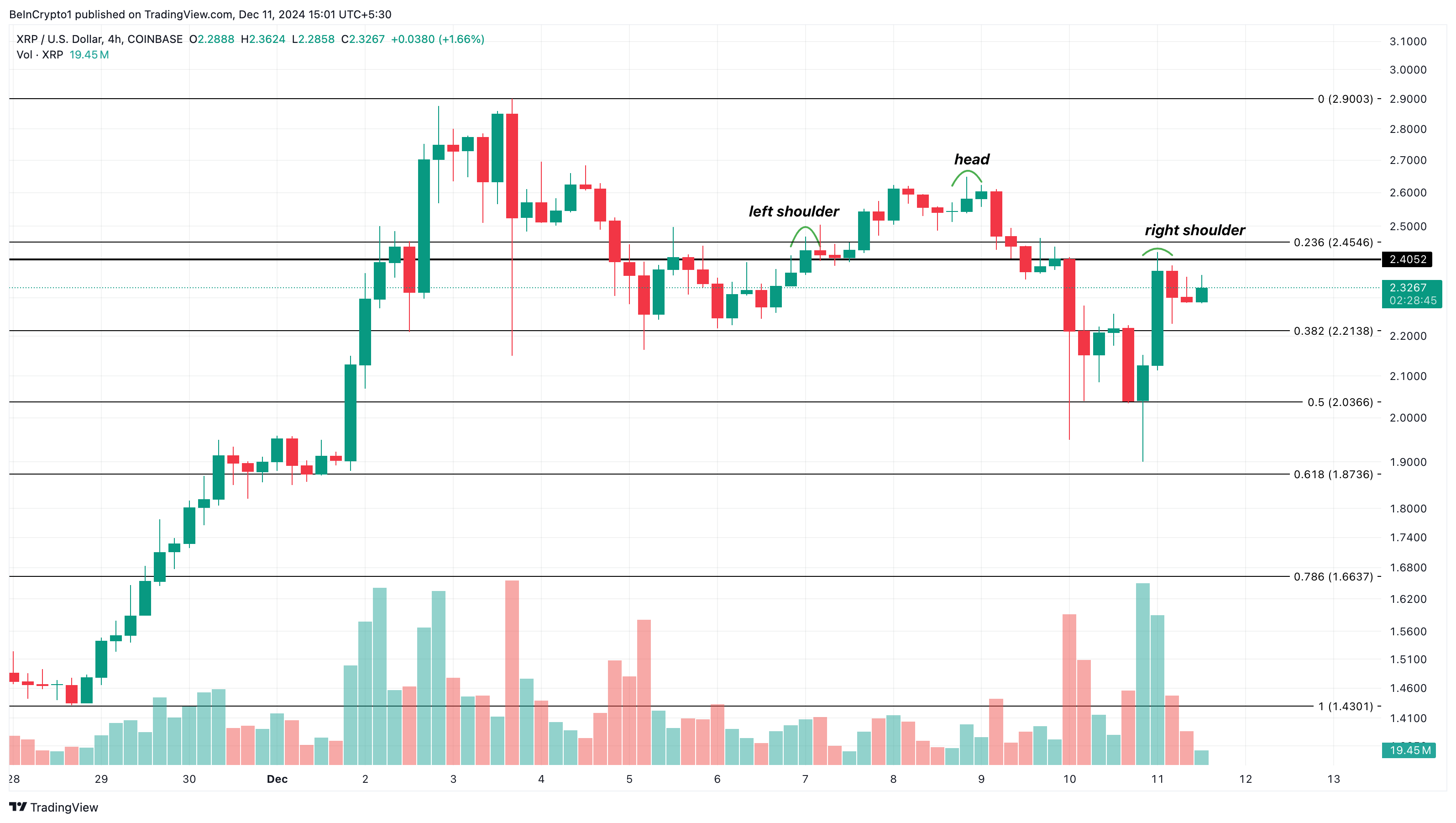 На 4-годинному графіку XRP сформував патерн «голова і плечі». Цей патерн є класичною формацією зміни тренду з бичачого на ведмежий. Він складається з трьох піків: ліве плече, за яким слідує вищий пік (голова), а потім нижчий пік (праве плече).
