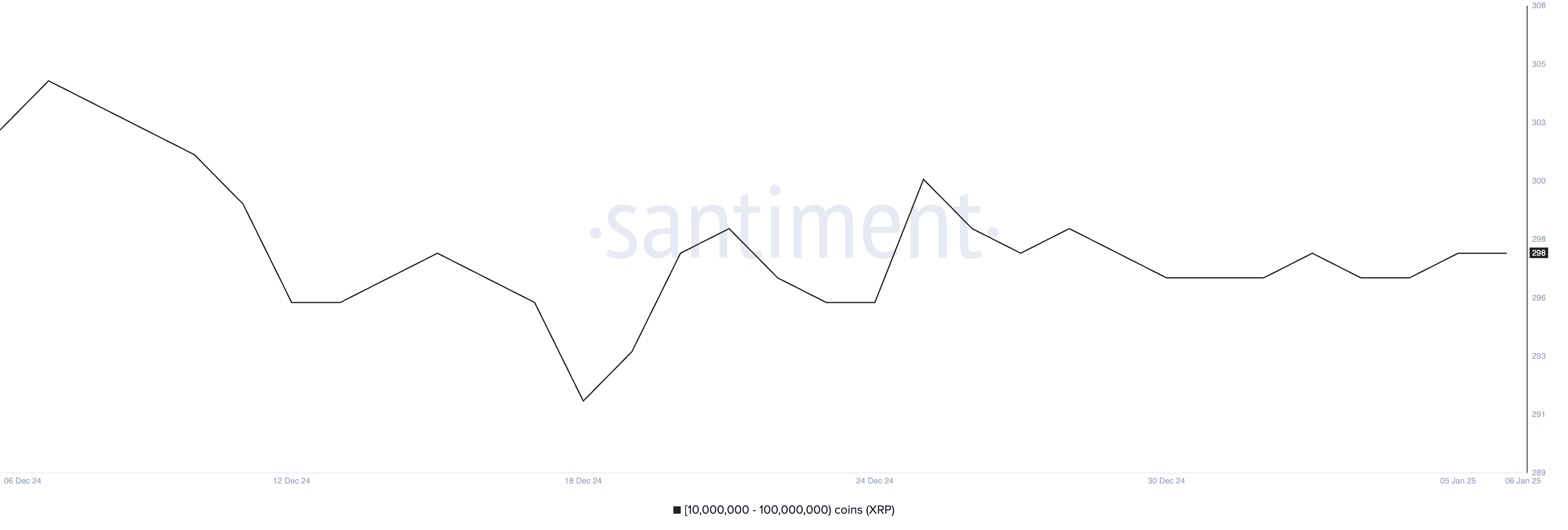 Кількість китів XRP, які тримають від 10 мільйонів до 100 мільйонів монет, нещодавно показала значні коливання. Після досягнення місячного максимуму в 305 7 грудня, кількість різко знизилася до місячного мінімуму в 292 18 грудня.