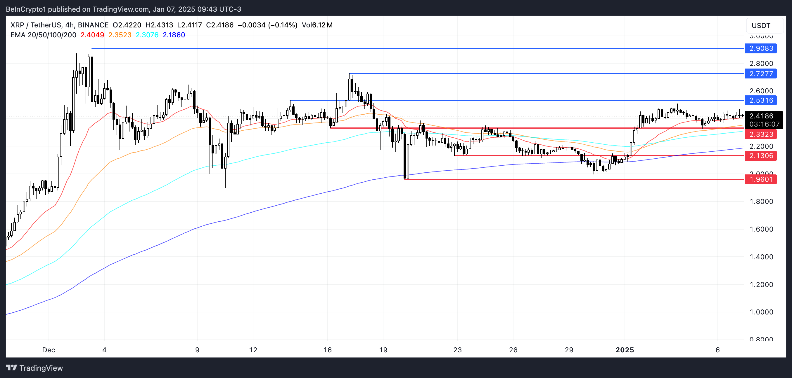 Лінії EMA для XRP вказують на невизначеність, без чіткого напрямкового сигналу на даний момент. Однак, якщо бичачий моментум повернеться, ціна XRP може протестувати опір на рівні 2,53 USD.
