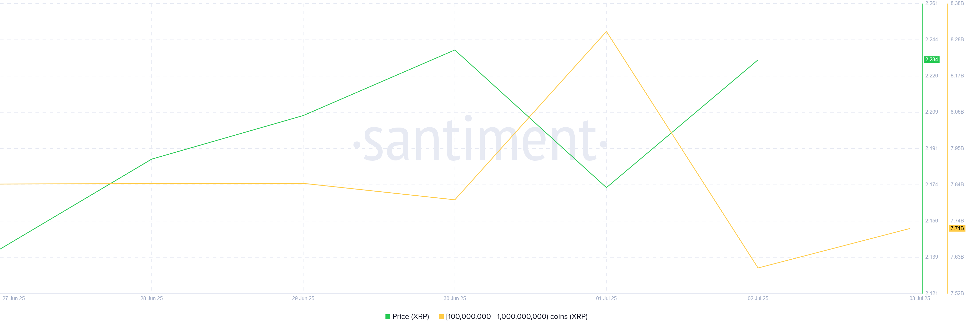 Цього тижня адреси, що утримують від 100 мільйонів до 1 мільярда XRP, продали понад 600 мільйонів XRP лише за 24 години, зменшивши свої запаси до 7,7 мільярда XRP. Загальна вартість проданого XRP перевищує 1,2 мільярда доларів, що свідчить про зростаючу невизначеність і відсутність віри серед цих китів у подальше зростання XRP.
