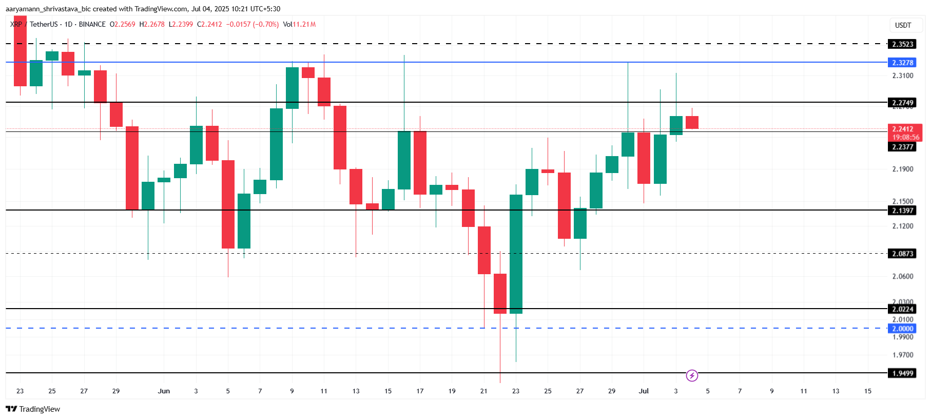 XRP продемонстрував ознаки відновлення, піднявшись з 1,94 доларів до поточної ціни 2,24 доларів. Незважаючи на цей позитивний імпульс, альткоїн стикається з суттєвим опором на рівні близько 2,27 доларів.