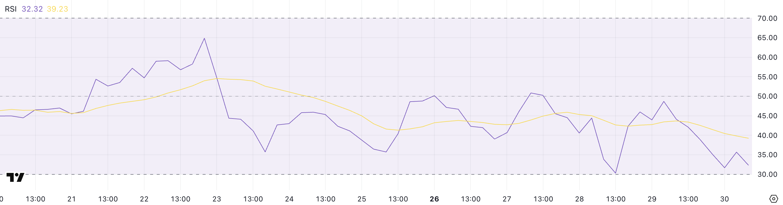 Поточне значення, близьке до 30, вказує на те, що XRP наближається до потенційної точки виснаження у низхідному тренді. Якщо покупці втрутяться, ціна може стабілізуватися або спробувати відновитися.