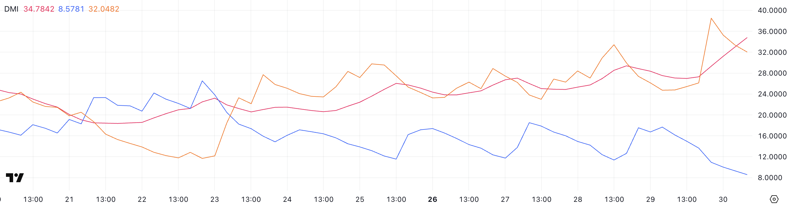 SponsoredРізке зростання ADX підтверджує, що поточний тренд посилюється. Однак напрямок цього тренду стає зрозумілим завдяки руху напрямних індикаторів: +DI впав до 8,57, тоді як -DI зріс до 32.