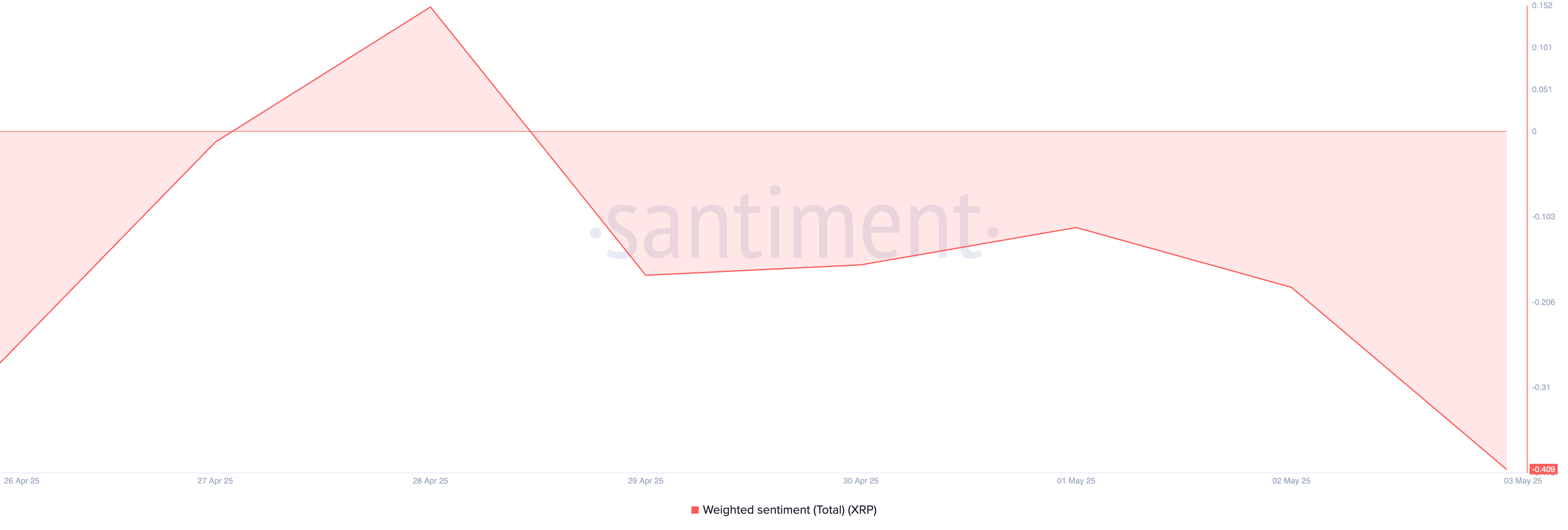 Крім того, зважений настрій XRP залишається в негативній зоні, підтверджуючи ведмежий прогноз. На момент написання він становить -0,40.