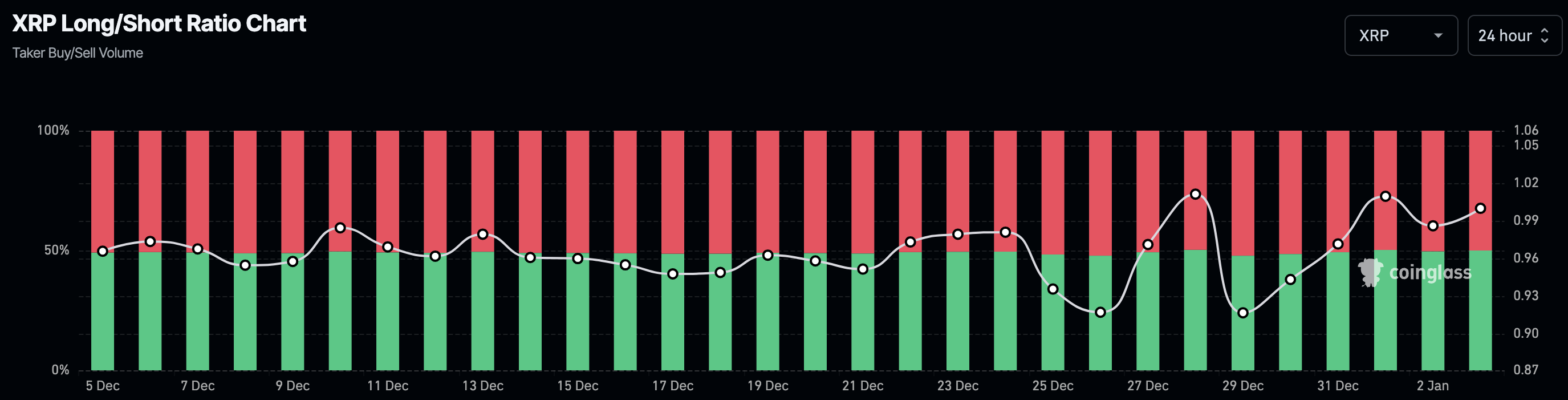 Згідно з Coinglass, співвідношення довгих/коротких позицій XRP піднялося вище 1. Це співвідношення вимірює очікування трейдерів. Коли рейтинг вище 1, це означає, що більше трейдерів з довгими позиціями, ніж з шортами.