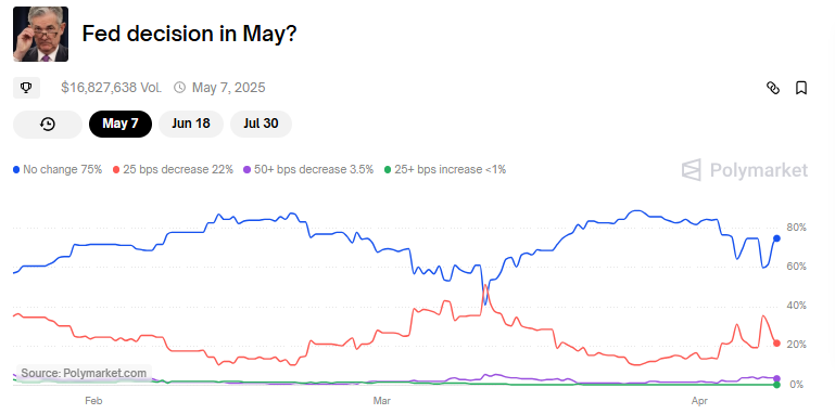 Sponsored SponsoredТрейдери зараз розглядають травень як потенційний старт для наступної хвилі ліквідності, з гравцями, які ставлять на 75% ймовірність того, що ФРС залишить ставки без змін. Якщо ці шанси зміняться, трейдери очікують, що за цим піде друк грошей.