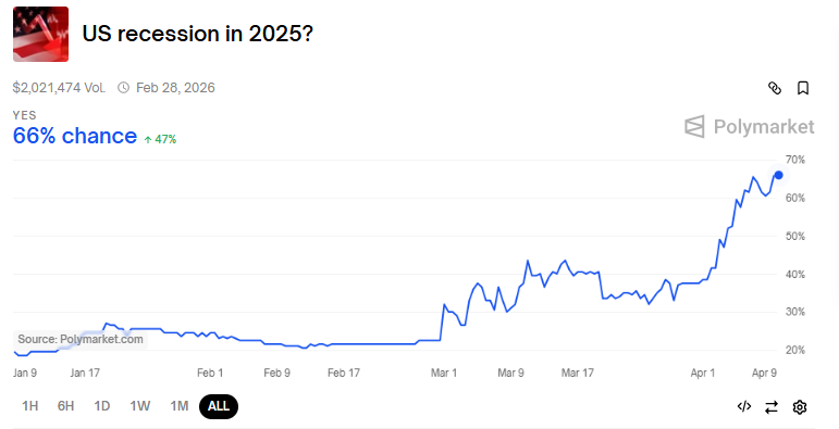 На тлі загострення торговельних напружень, учасники ставок на Polymarket бачать майже 70% ймовірність рецесії у США після тарифів на День визволення.