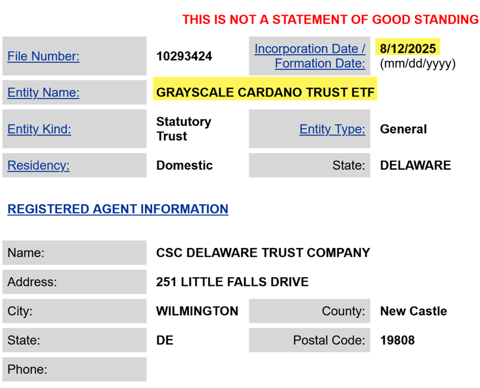 Портал публічного реєстру Делавера показує нові подання для Grayscale Cardano Trust ETF та Grayscale Hedera Trust ETF. Цей крок часто розглядається як передвісник формальної заявки на ETF.