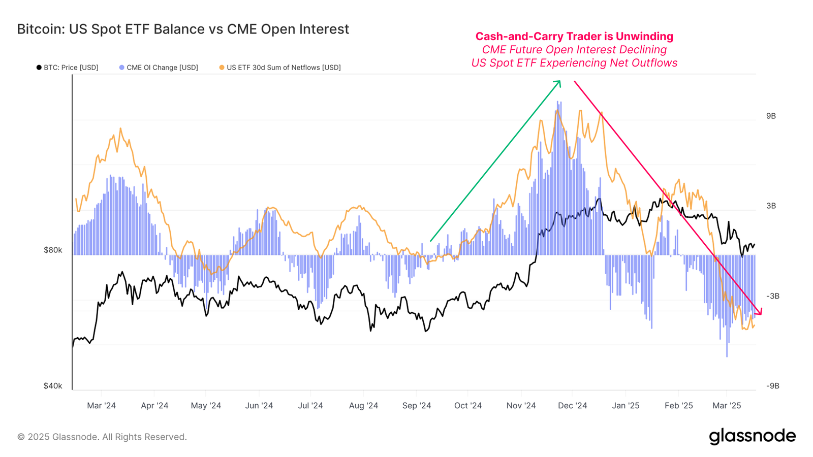 Сильні докази торгівлі на різниці можна знайти, порівнюючи потоки в американські спотові ETF і відкритий інтерес (OI) за ф’ючерсними контрактами CME. Коли упередженість на довгу сторону на ринку починає слабшати, розгортання цієї торгівлі на різниці стає очевидним. За минулий місяць це призвело до найбільших відтоків з ETF і зниження відкритого інтересу, що позначило 12-місячний мінімум.