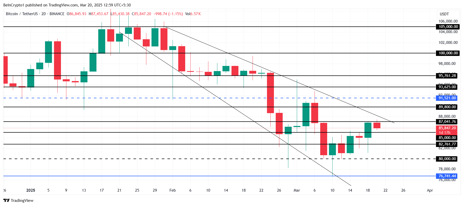 Біткоїн намагається вийти з двомісячного низхідного клину, що представляє бичачу можливість для криптокороля піднятися вище 90 000 доларів. Успішний прорив опору на рівні 89 800 доларів підтвердить цей вихід, потенційно ініціюючи новий висхідний тренд.