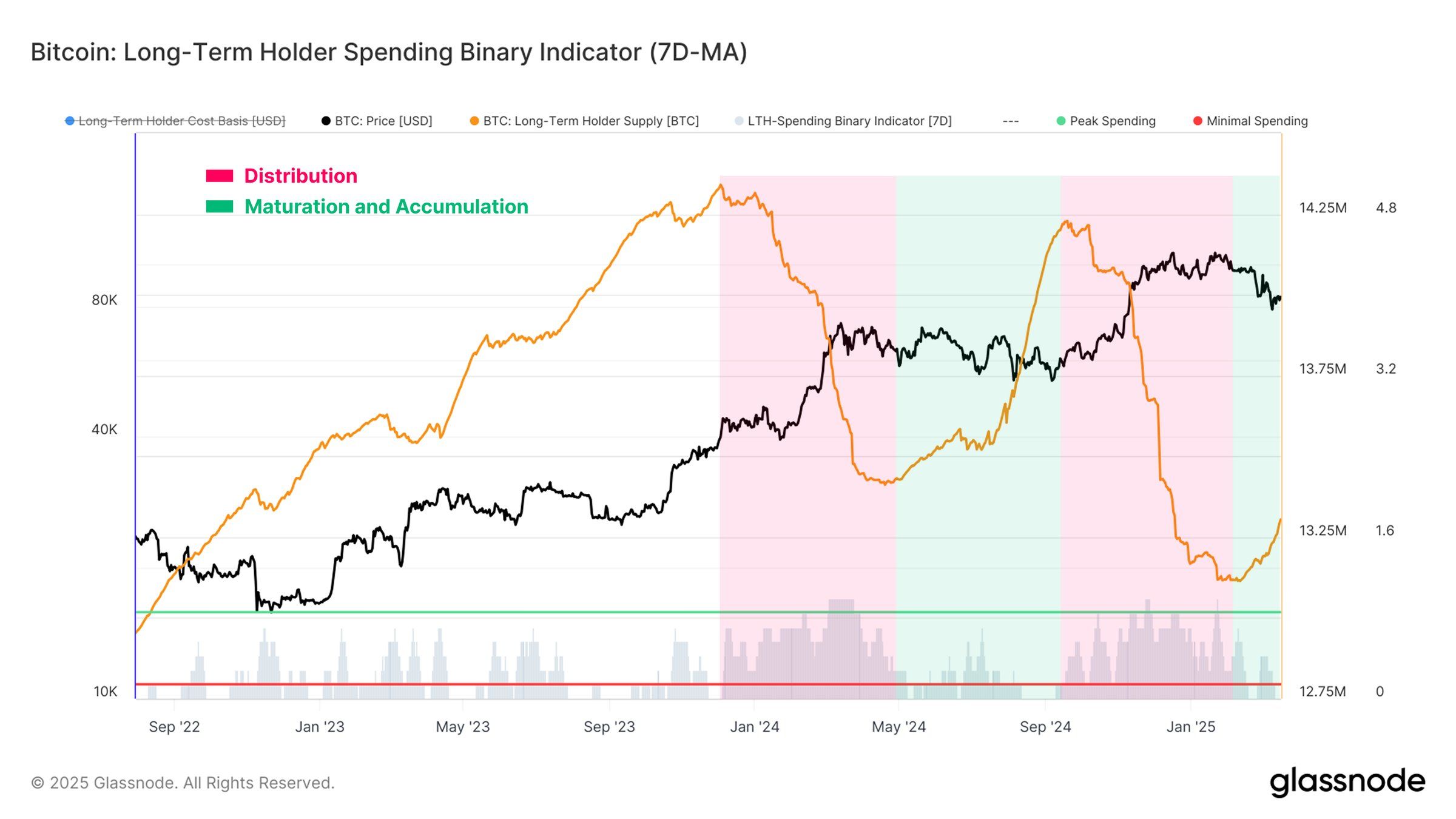 Сповільнення цієї поведінки витрат свідчить про те, що LTH менш схильні продавати, що вказує на більшу впевненість у збереженні активів протягом цього волатильного періоду. Історично, коли ця тенденція відбувається, це призводить до фази накопичення, оскільки утримувачі чекають на більш сприятливе ринкове середовище.