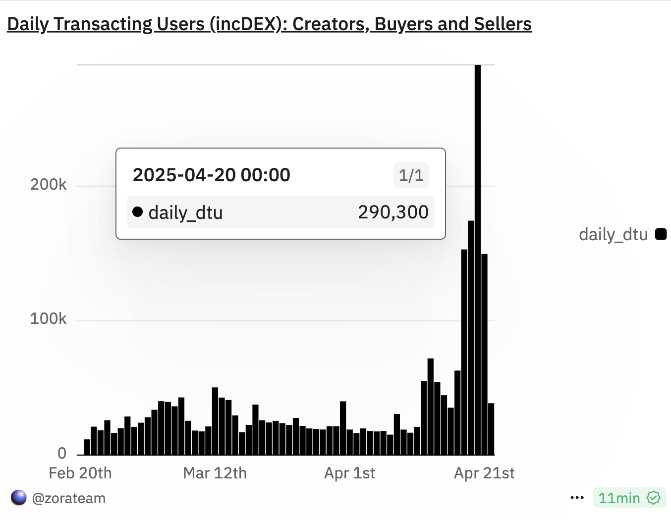 У нещодавньому дописі на X (раніше Twitter), Поллак поділився графіком, що ілюструє різке зростання щоденних користувачів, які здійснюють транзакції на Zora, досягнувши піку в 290 300.
