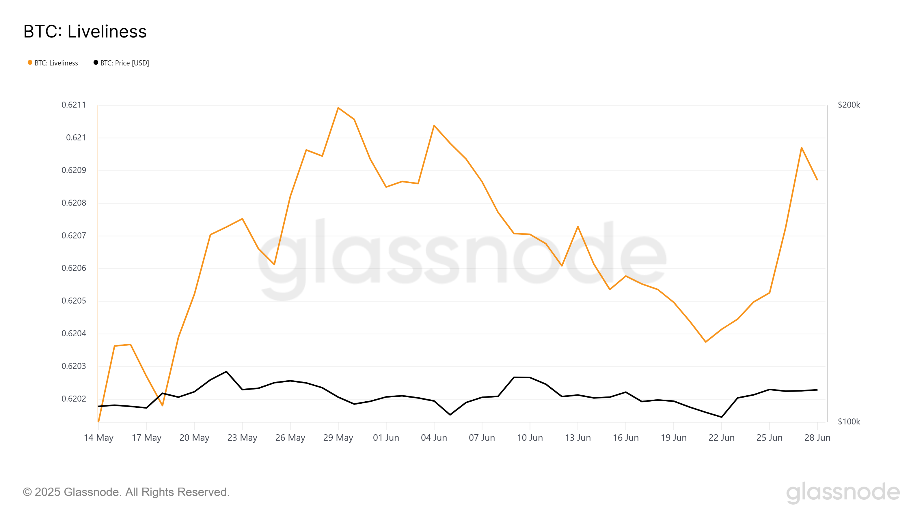 Зростання Liveliness зазвичай сигналізує про те, що довгострокові утримувачі (LTH) переміщують свої активи замість того, щоб їх утримувати. Ця зміна свідчить про те, що LTH вирішують продавати свої активи, а не накопичувати, що відображає дії китів.