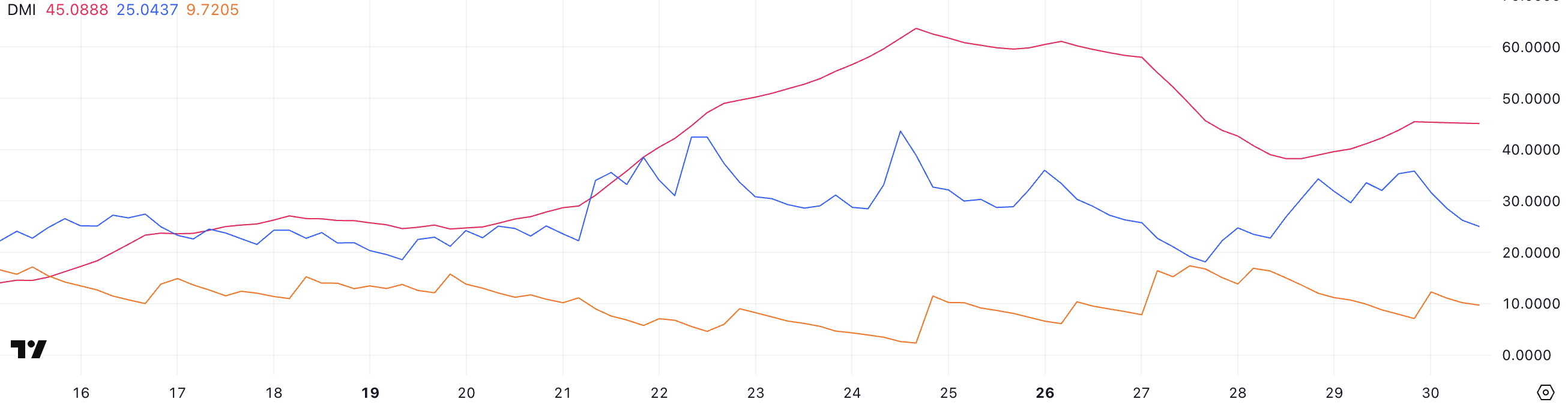 Графік DMI Zebec Network показує, що його ADX наразі становить 45, що вказує на сильний тренд, хоча трохи нижче піку 57,9, зафіксованого три дні тому.