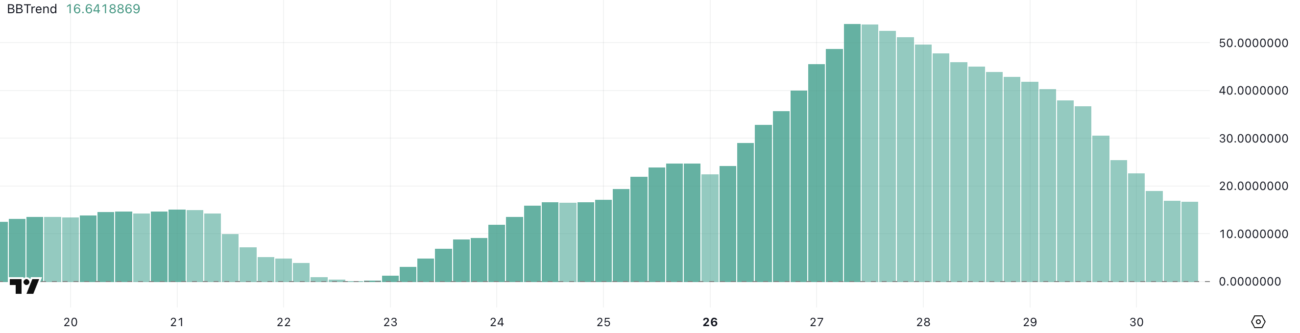 Лише три дні тому BBTrend досяг піку на рівні 53,9, що вказує на підвищену волатильність і сильну напрямкову силу на той час. Хоча поточне значення значно нижче, воно все ще відображає продовження умов висхідного тренду, хоча й з можливим уповільненням імпульсу.