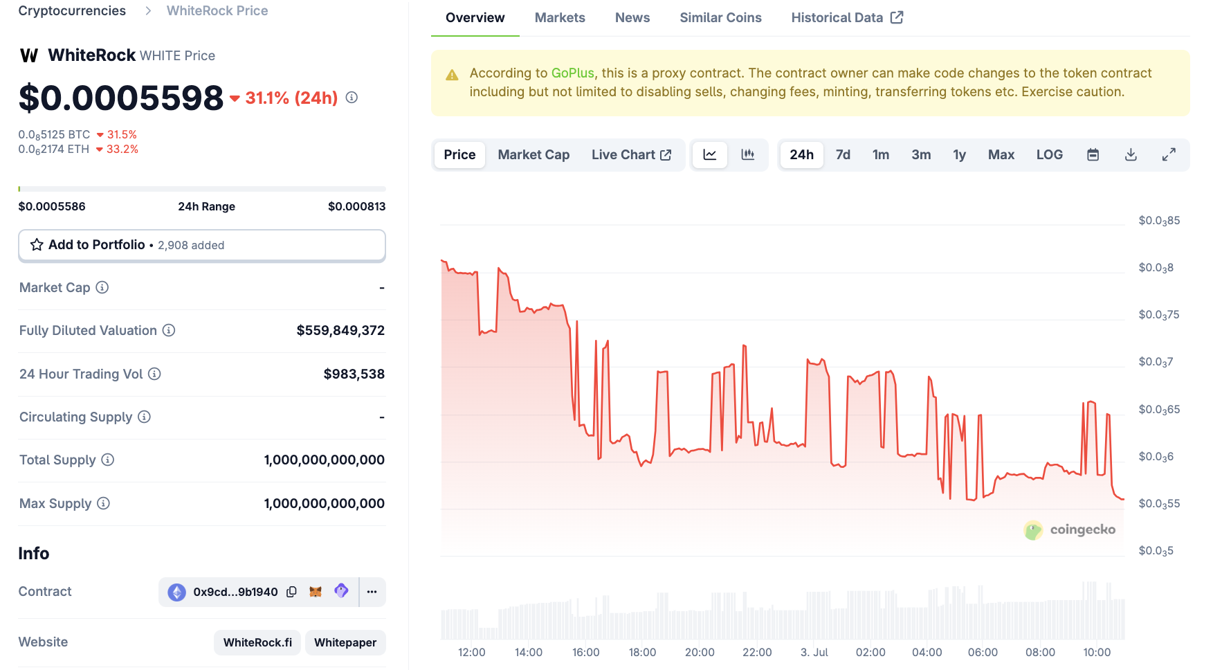 WHITE впав більш ніж на 30 % у зв’язку з новинами про арешт. Спільнота закликає біржі, такі як MEXC та Gate.io, видалити токен з лістингу.