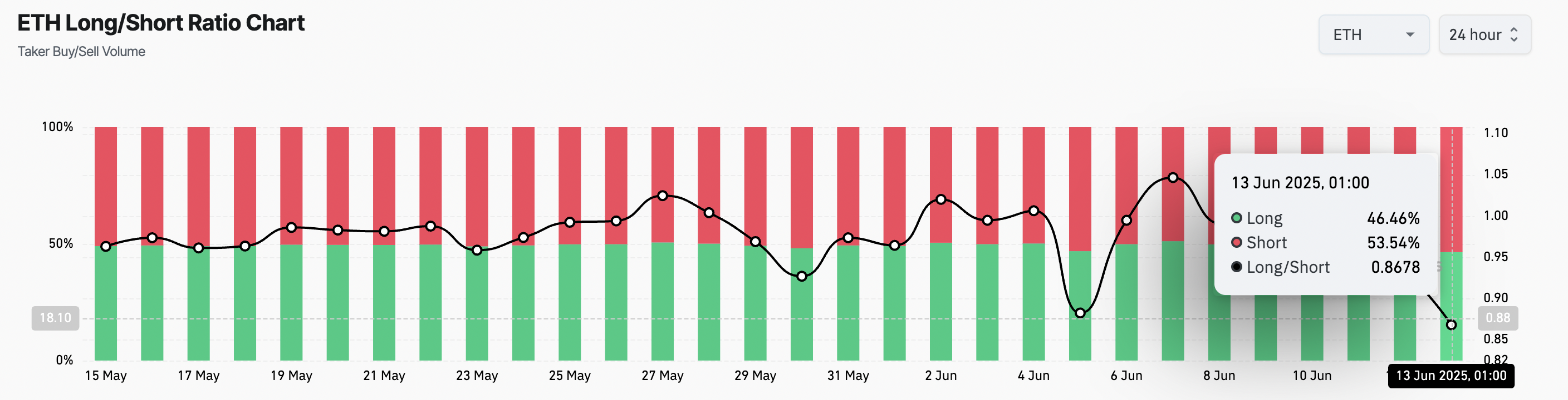 Це співвідношення порівнює кількість довгих і коротких позицій на ринку. Коли співвідношення лонгів/шортів активу перевищує 1, це означає, що довгих позицій більше, ніж коротких, що вказує на те, що трейдери переважно роблять ставки на зростання ціни.