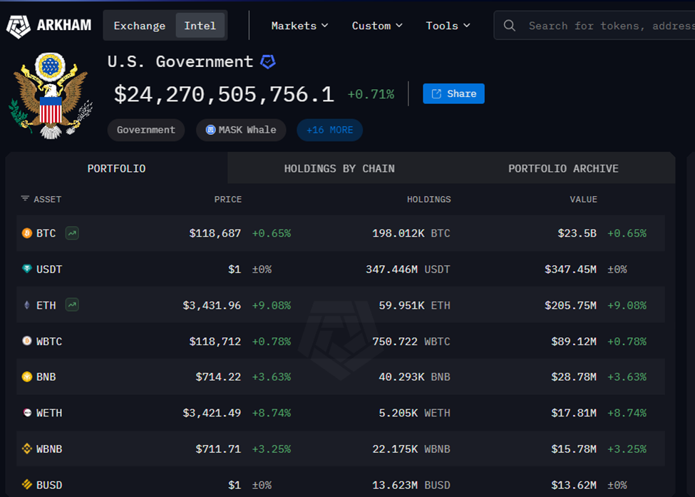На момент написання статті біткоїн торгувався за 118 493 доларів, що на 0,2 % більше за останні 24 години. Вартість державних активів оцінюється приблизно в 3,43 мільярда доларів за цими курсами. Це значно менше, ніж 23,5 мільярда доларів, які оцінила аналітична компанія Arkham Intelligence.