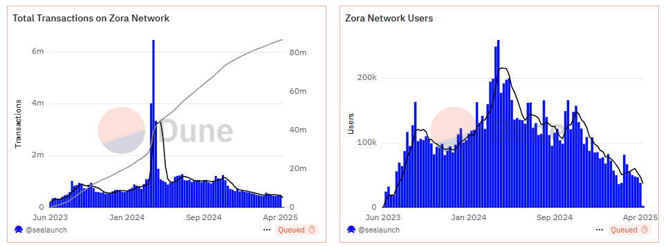 На момент написання, дані з Dune показують, що мережа Zora обробила понад 87 млн транзакцій. Наразі вона приваблює близько 37 000 активних адрес на день.