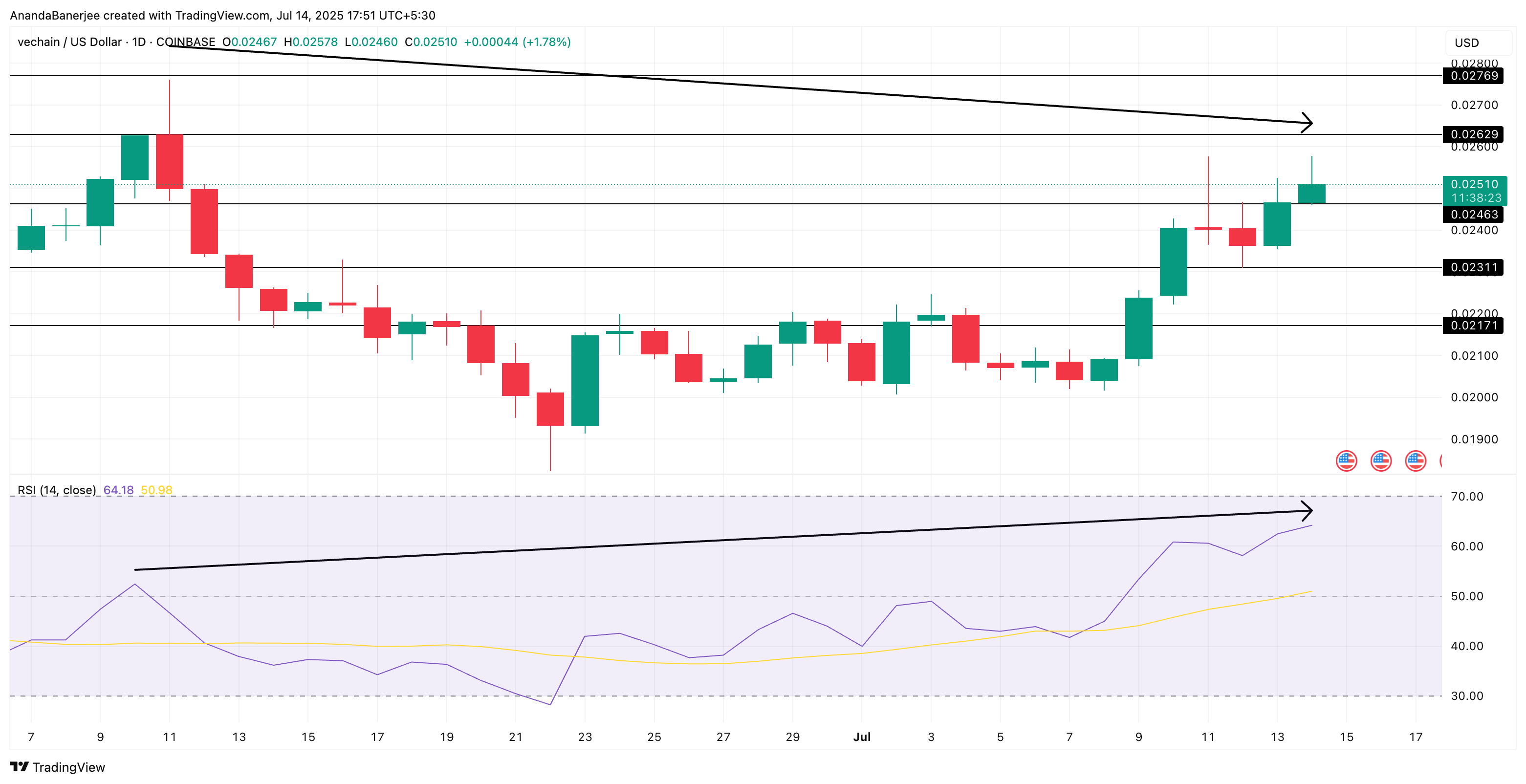 Sponsored SponsoredПоки VET тримається вище 0,023 долара і продовжує нарощувати силу RSI, тренд залишається конструктивним.