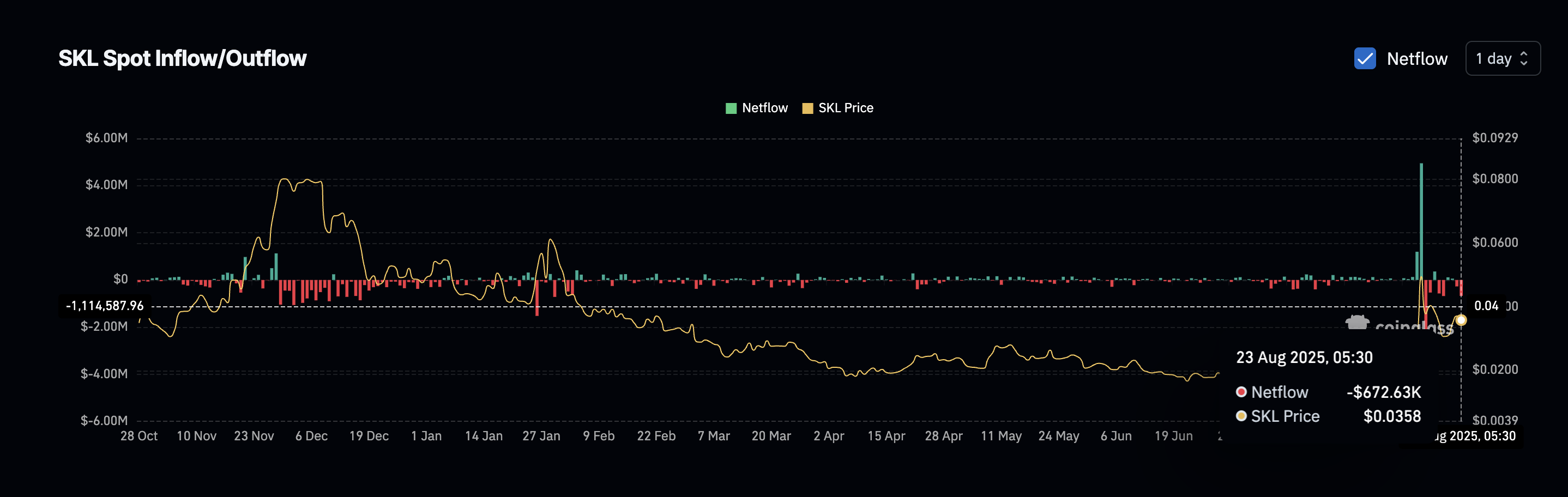 Sponsored SponsoredБалансовий обсяг зріс з 13,93 млрд 16 серпня до 19,98 млрд 22 серпня, навіть коли ціни досягли нижчого максимуму. Це свідчить про те, що накопичення триває. Дані про чистий потік також показують стабільні відтоки, що свідчить про зменшення тиску з боку продажів.