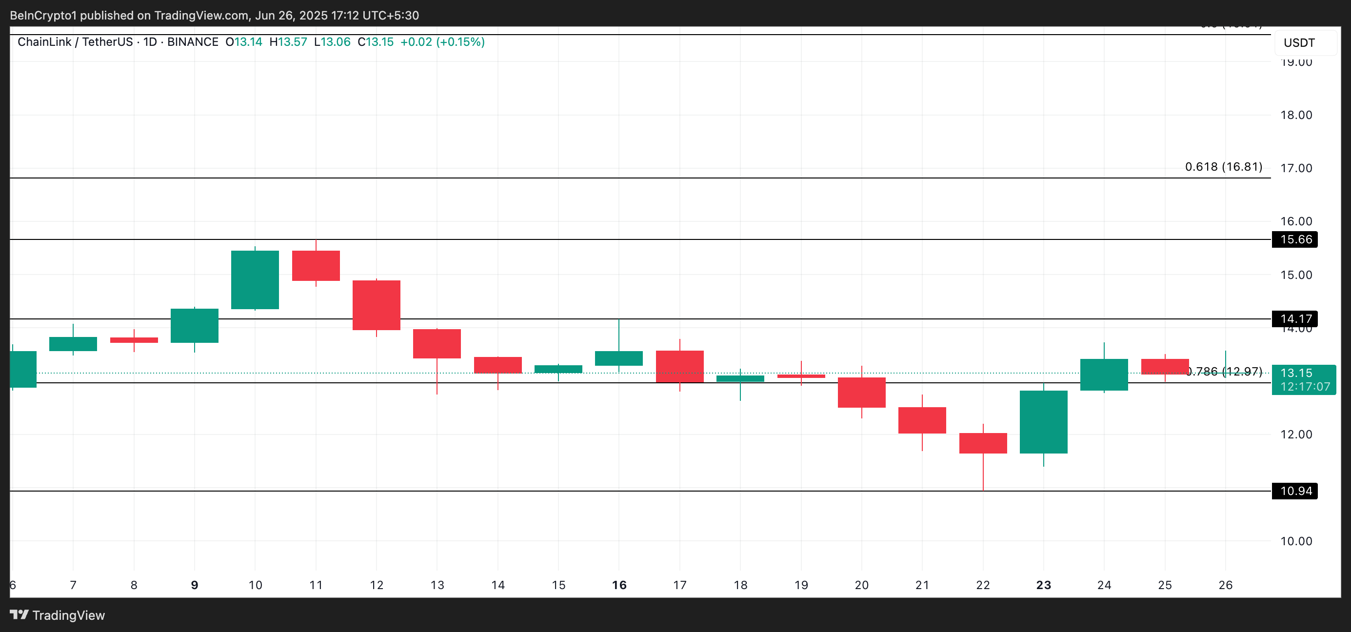 На момент публікації, альткоїн торгується за ціною 13,15 доларів. Відновлення попиту на новини про альткоїн може підштовхнути його ціну до 14,17 доларів.